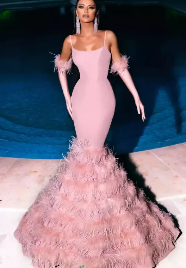 Step out of your comfort zone and wear this fun and flirty long dress PS23032 by Portia and Scarlett. Displaying a lovely scoop neckline, this chic mermaid dress is perfect if you want to stand out at your next special event. Made out of, figure flattering, novelty material, this show stopping dress is complemented by trendy feathers along the flare of the fitted skirt. This gown comes with the matching gloves.