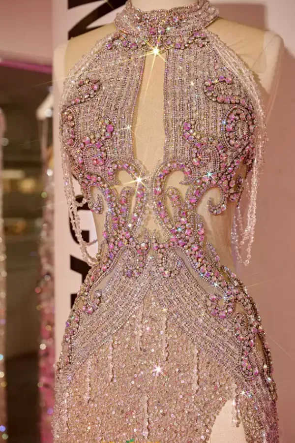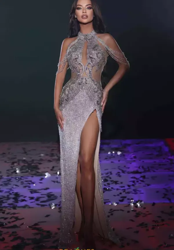 Live out your celebrity moment while wearing this one of a kind Portia and Scarlett dress PS23704C. Glamorous fitted dress reveals a halter neckline and is accompanied by beaded, layered, off the shoulder cap sleeves. Sheer bodice is beautifully adorned with shimmering beadwork that trickles down the lovely fitted skirt. Complimented by a risque thigh high slit, this gorgeous dress will definitely make you stand out.