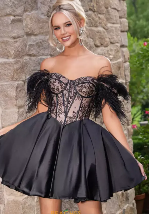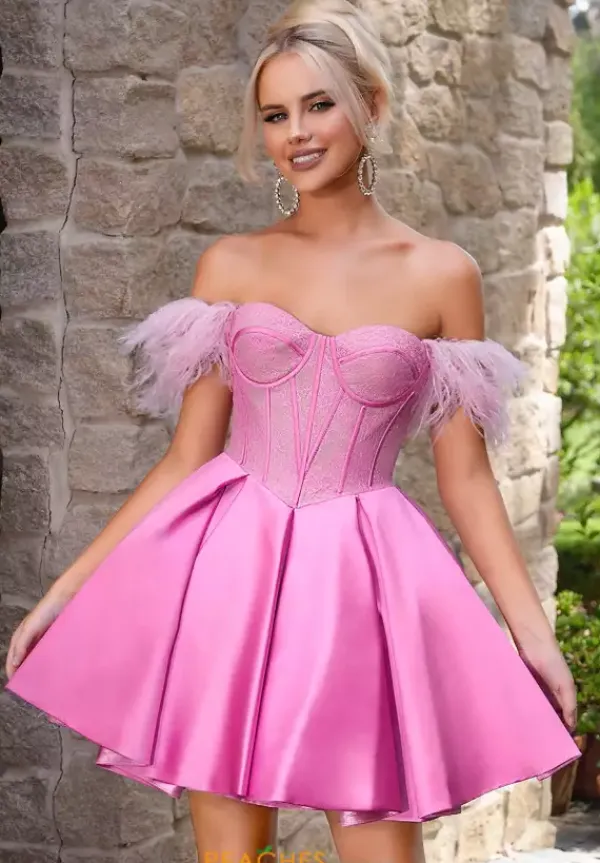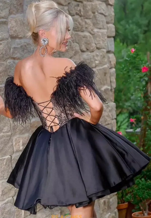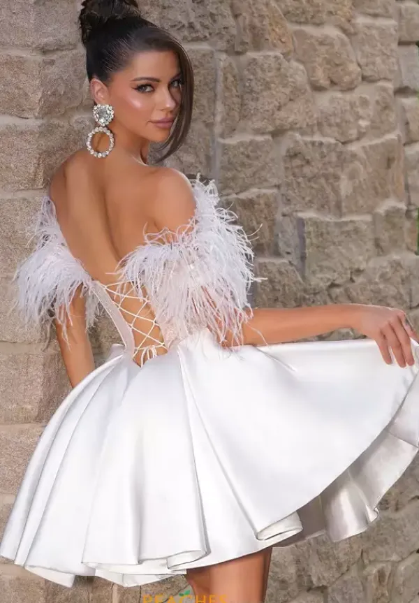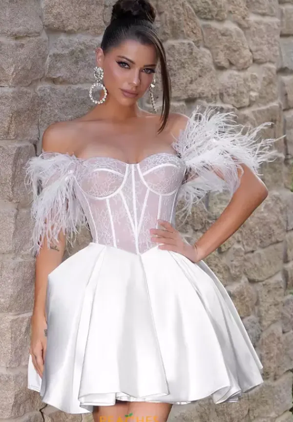 Look as if you belong on the cover of a magazine in this sweetheart neckline dress made by Portia and Scarlett, style PS24417. There are three amazing colors that this dress comes in, including a black, pink, and white. This dress is off the shoulder, uses lace for its corset, and has breathtaking feathers for cap sleeves that shape the entire look.
