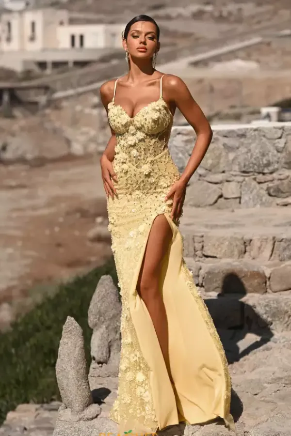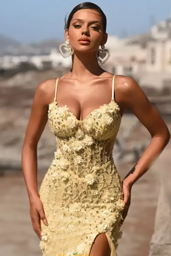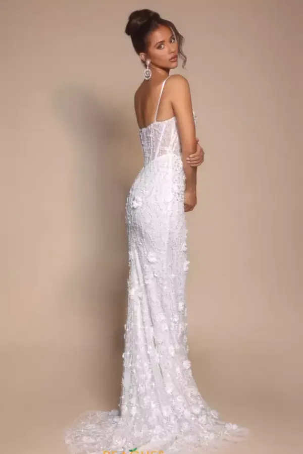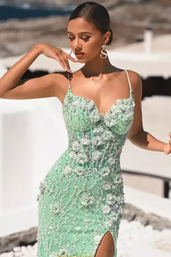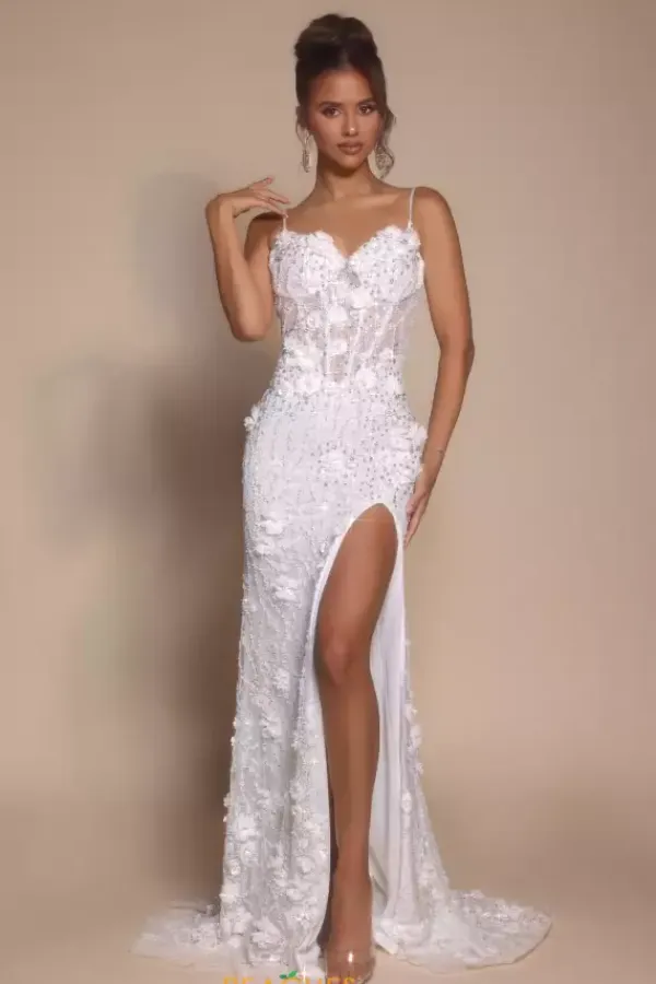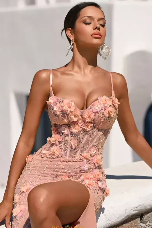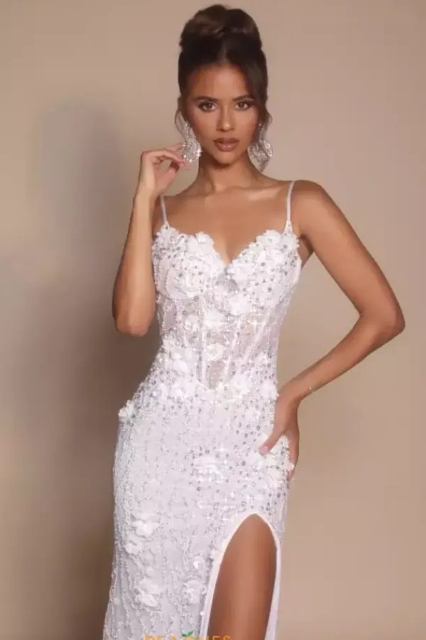Look picture perfect at Prom in this shimmering Portia & Scarlett long dress style PS25294 made in beaded cracked ice fabric with 3D flowers and appliques. Offered in a beautiful pink color, this stellar gown showcases a corset bodice with V neckline, exposed boning, spaghetti straps and zipper back. The long slim skirt has a high front side slit to show off your legs.