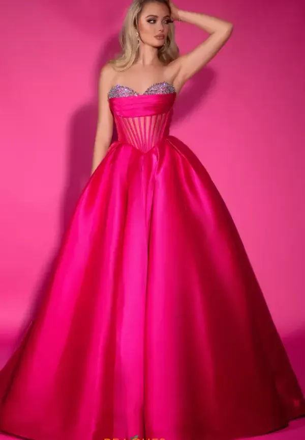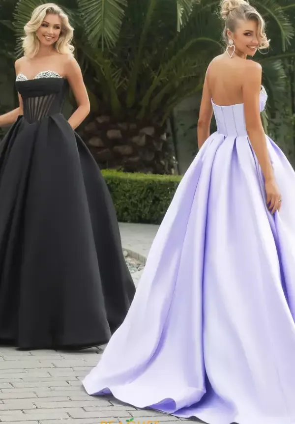 Ultimate sophistication exudes when you wear this Portia and Scarlett ball gown style PS25306 to Prom. Made in rich satin fabric, this elegant silhouette showcases a strapless corset with peek a boo beading on the sweetheart neckline, visible boning and mid low zipper closure back. The long, ball gown skirt has inverted pleats for extra fullness and a small back train.