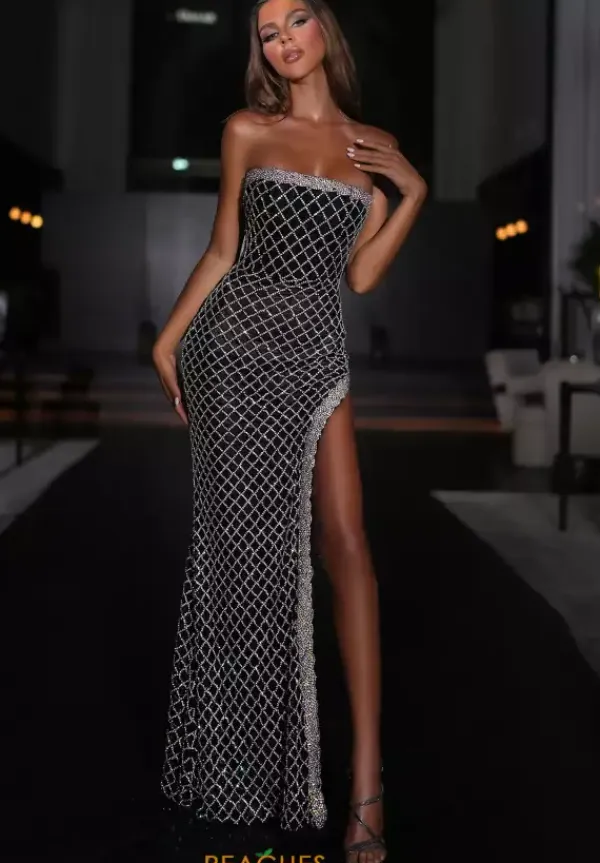 Wow the crowd in this outstanding long fitted dress from Portia and Scarlet style PS25430C. It consists of a strapless neckline where sparkling beads outline the neckline and the high thigh side slit. This number is fully embellished by an intricate bead work pattern that initiates from the bodice and goes down to the skirt.