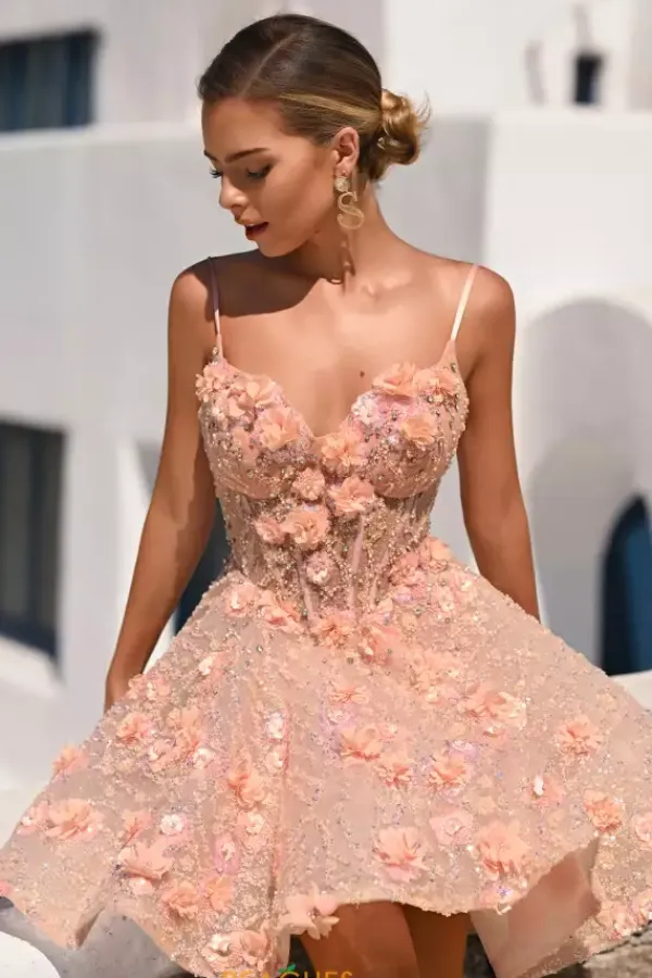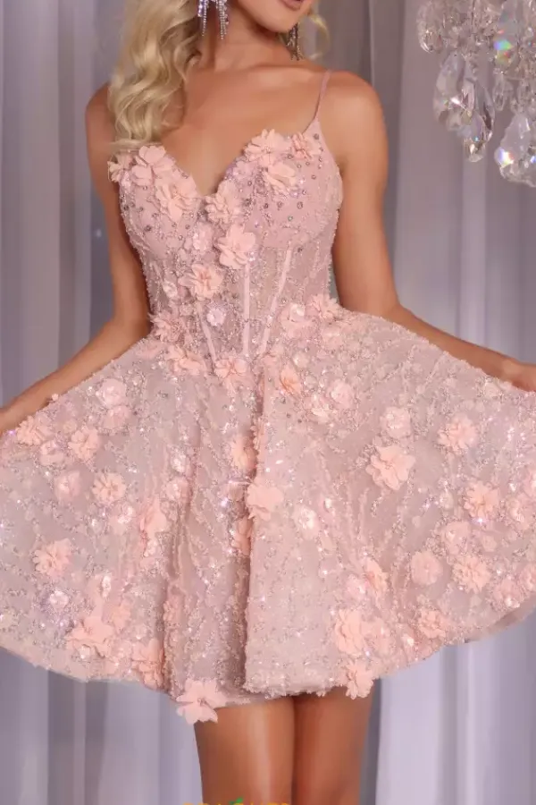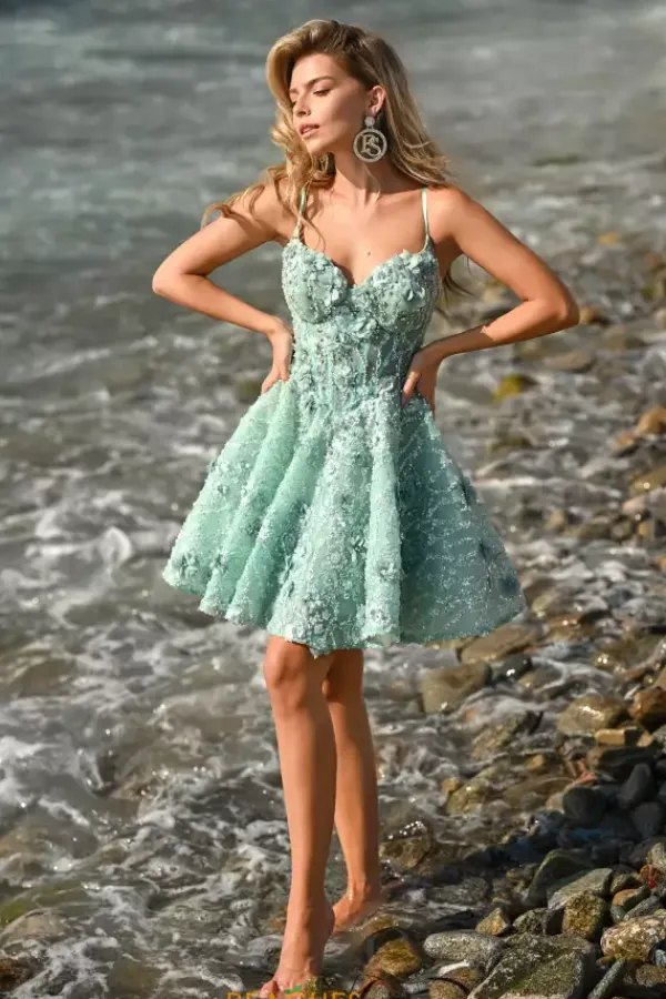 Dance the night away with this short and A line style dress made by Portia and Scarlett, style PS24703. This V shaped neckline dress is completely strapless and made with stunning applique and beaded details that will have you dazzling throughout the entire night of your event. This floral dress comes in three amazing color options including a gorgeous green, a a beautiful blush, and and a perfect pink shade as well.