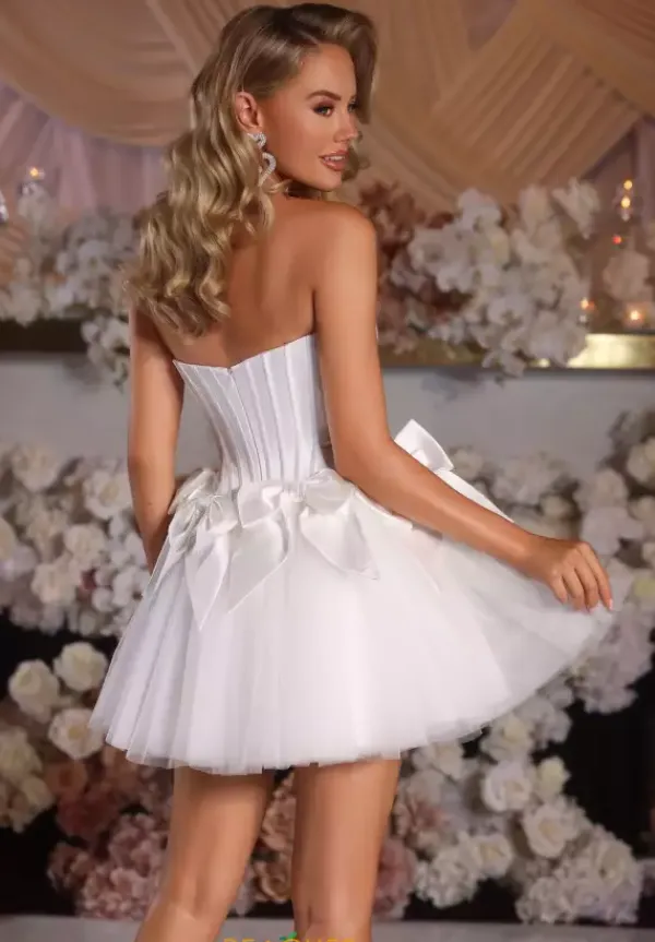 Feel cute yet elegant at your social event when you wear this Portia and Scarlet short dress, style PS25709. This A line dress features a flattering strapless scoop neckline. The bottom skirt made from tulle material giving you that breathtaking A line silhouette. This captivating corset will hug your waist beautifully. To finish off this look, this dress is adorned with bows around the waistline.