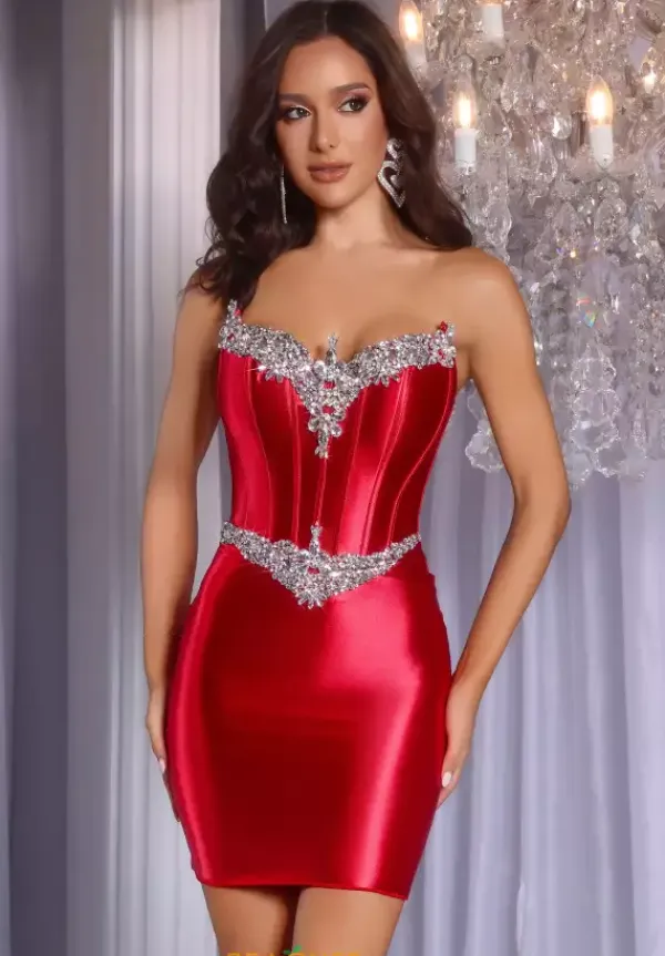 Be sleek and glamorous in this fitted short Portia and Scarlett dress style PS25741. This strapless dress features amazing rhinestone and gems along the bust of the corset inspired bodice. The waist is defined with those matching rhinestone beading and stretchy material to show off your hourglass figure.