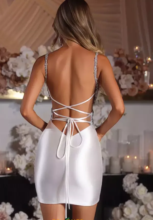 Be picture ready when you decide to wear this magnificent dress by Portia and Scarlett style PS25743. This fitted short dress features a v neckline supported with two bedazzled straps held up by a fitted corset lace up. The bodice reveals a beautiful beading pattern which harmoniously flows with the cut outs on the side and the middle of the stomach. The satin skirt is the finishing touch to this amazing dress.