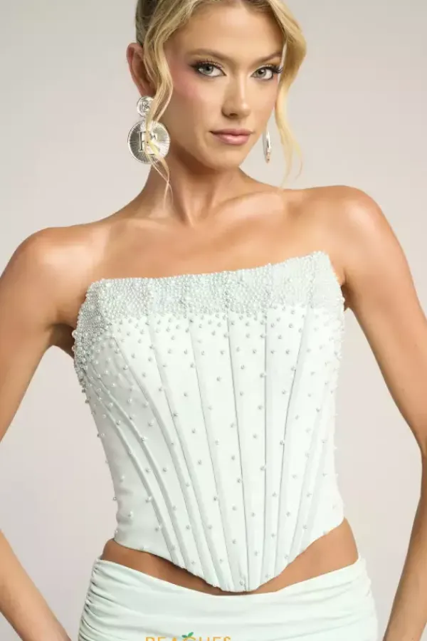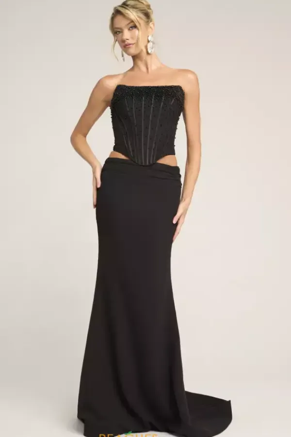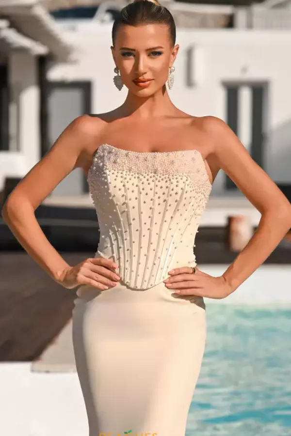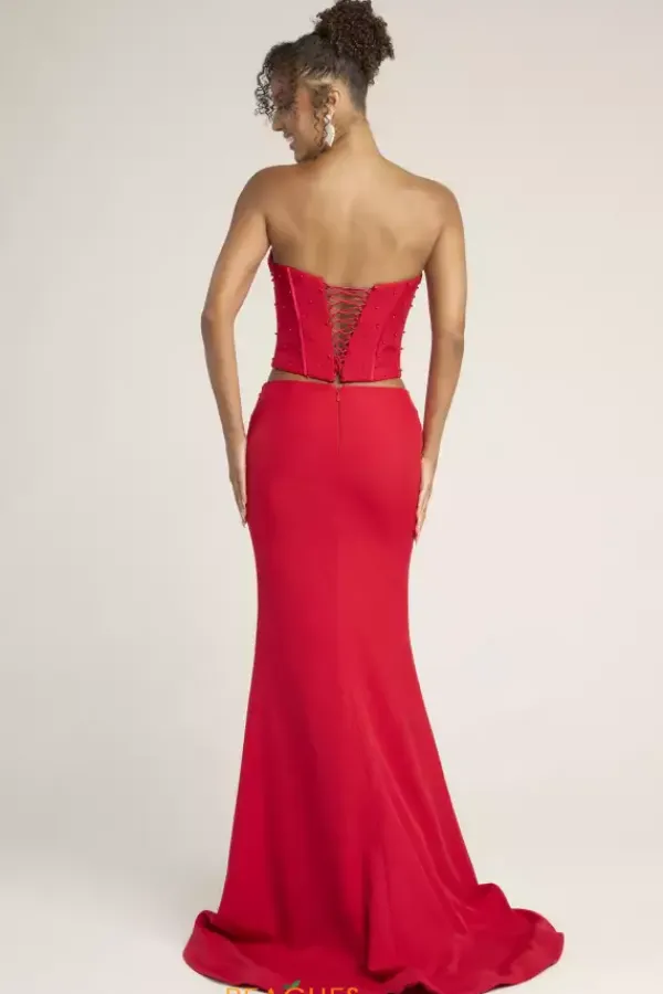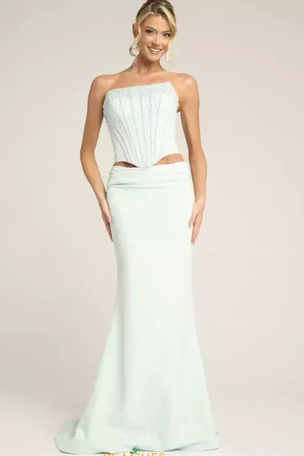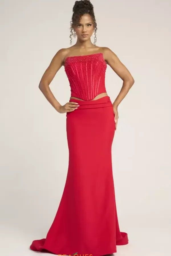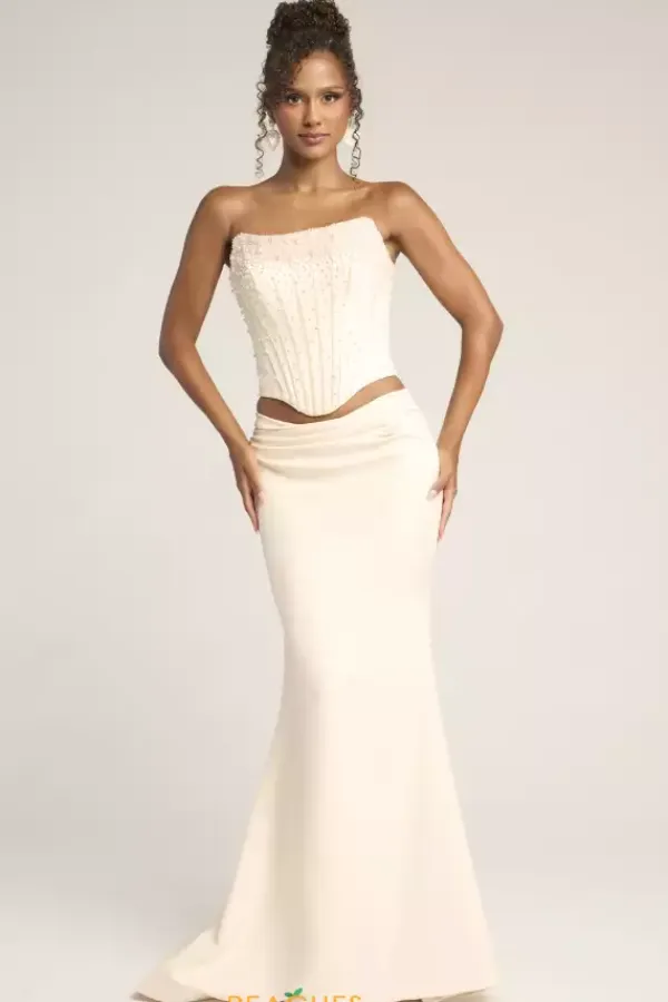Sleek sophistication exudes when you wear this Portia and Scarlett two piece dress style PS26007. This impeccable ensemble showcases a strapless corset embellished with pearls with visible boning and lace up tie low back. The long slim skirt is made of rich crepe fabric and falls to the floor with a sweep train.