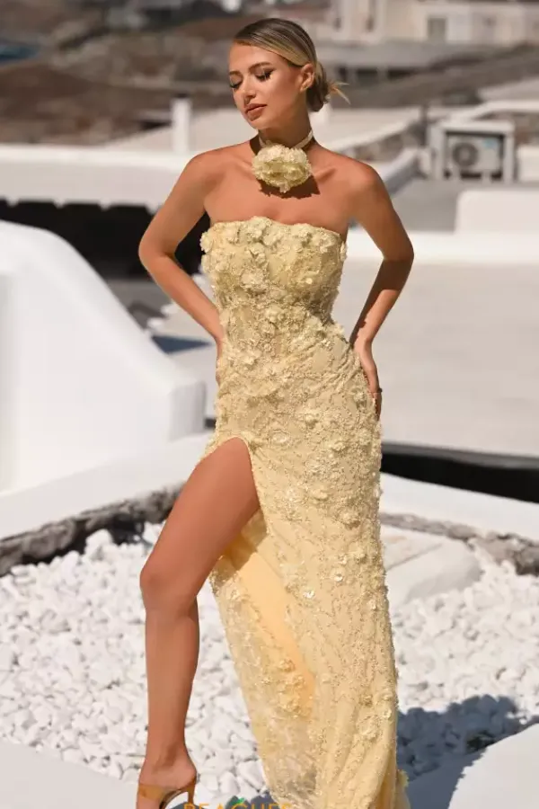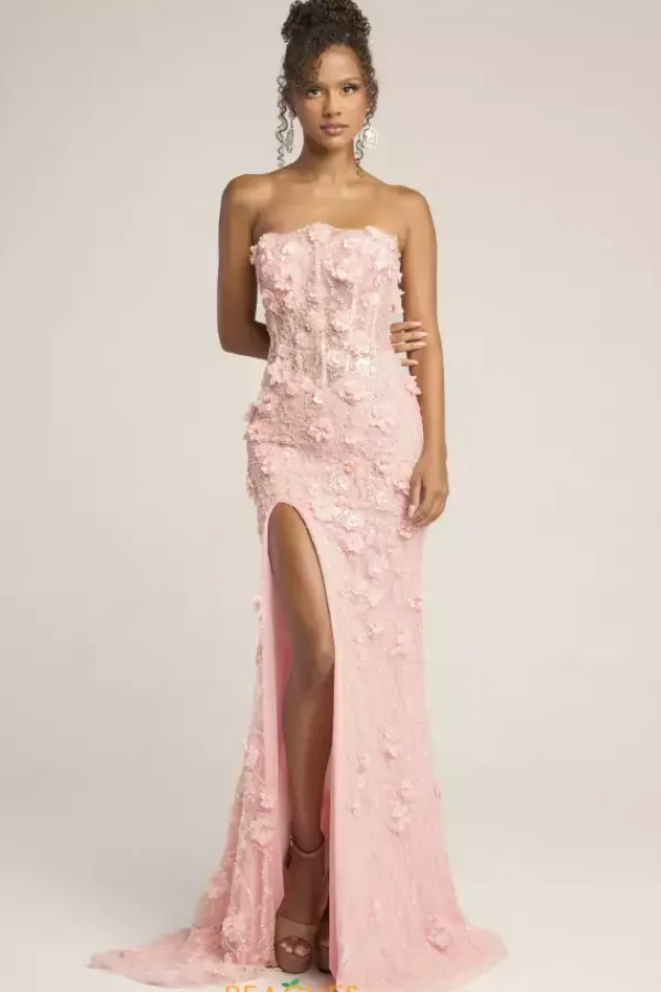 Have all eyes on you at your next special event in this glamorous gown by Portia and Scarlett PS26011. Featuring a strapless fitted corset bodice that will hug your shape beautifully and show off your natural curves. Adorned entirely in a gorgeous beadwork and a touch of floral detail to add a touch of glam.