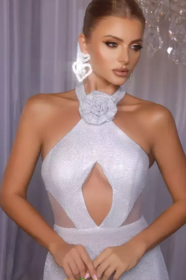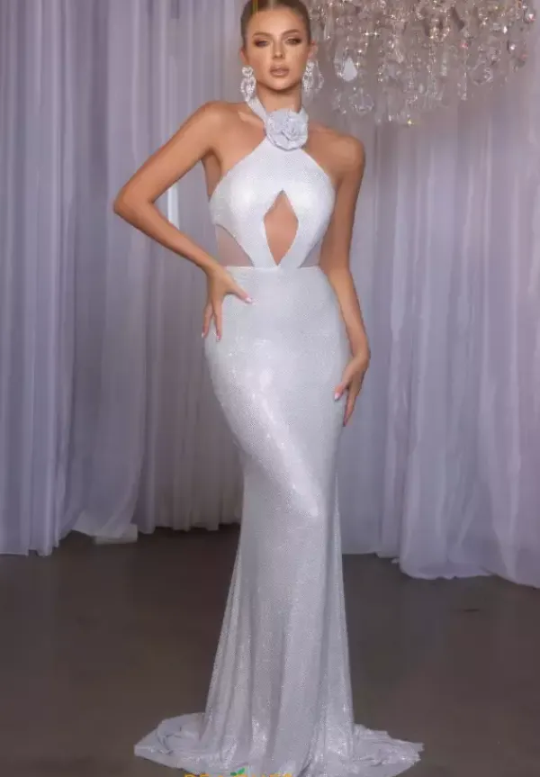 Feel like you just stepped off the red carpet and into your event in this jaw dropping Portia and Scarlett fitted dress style PS26020. This long fitted dress has a high halter neckline that clasp at the nape of your neck. A three dimensional flower is in the front adds to the glam. The fitted bodice has a key hole opening with cut out sides. The dress is sparkling in glitter material.