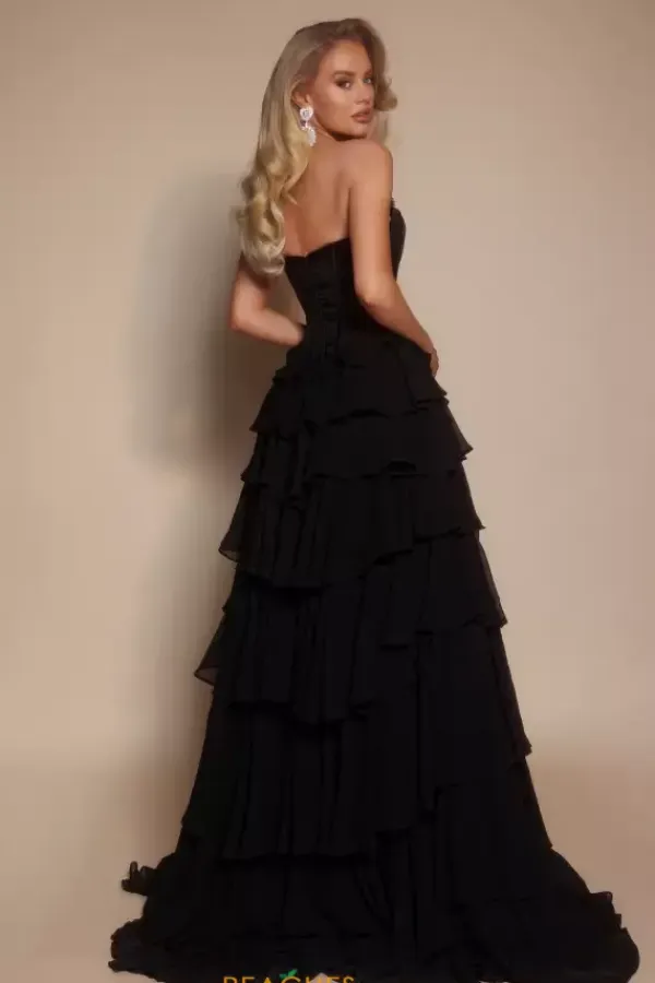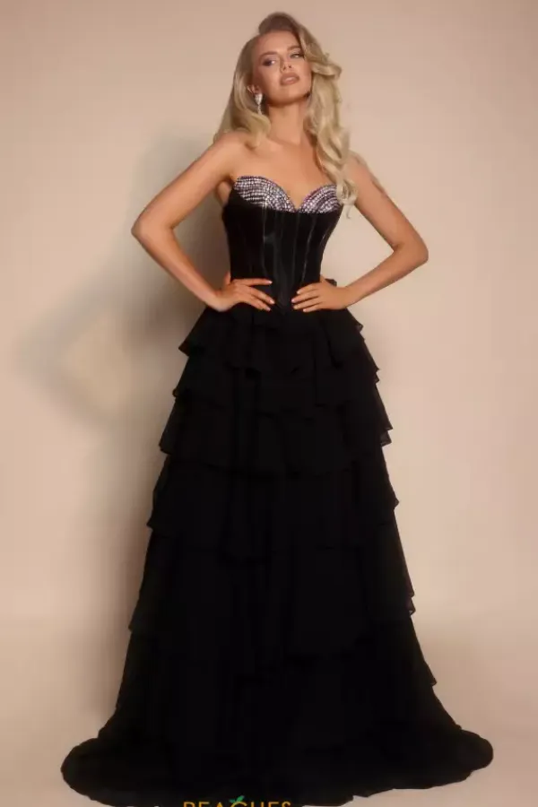 Look like Hollywood royalty at this years Prom wearing this tremendous taffeta Portia and Scarlett long dress style PS26024. This absolutely gorgeous gown showcases a structured corset bodice with a strapless, sweetheart neckline with peek a boo beading and a low zipper closure back. The long, a line skirt has ruffled tier layers with a slit and small back train.