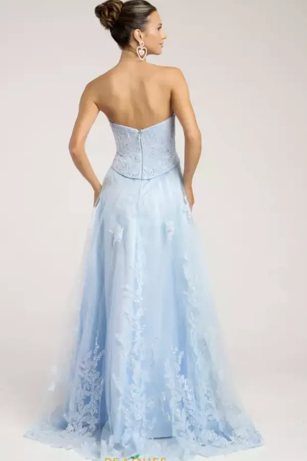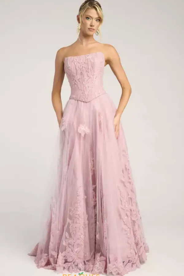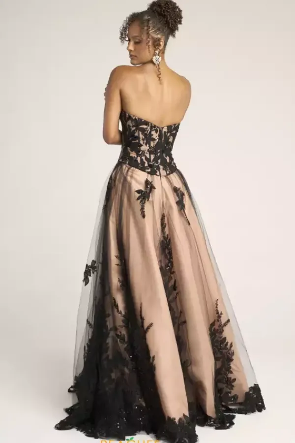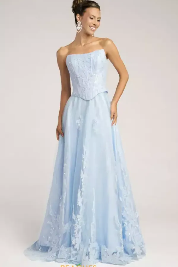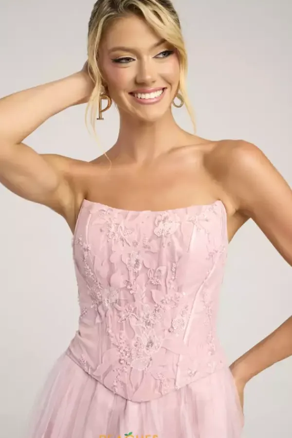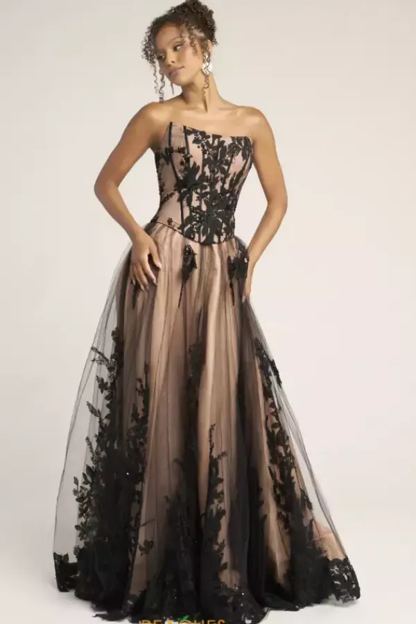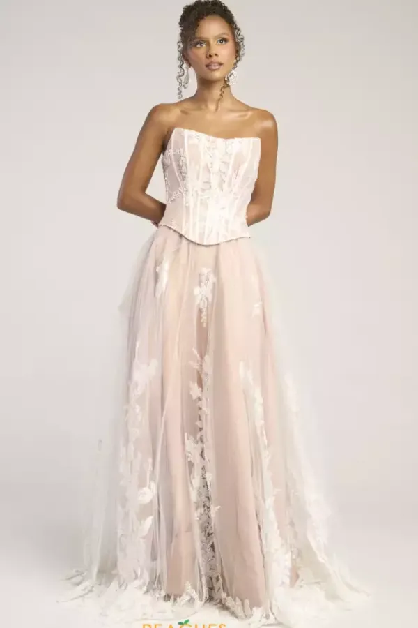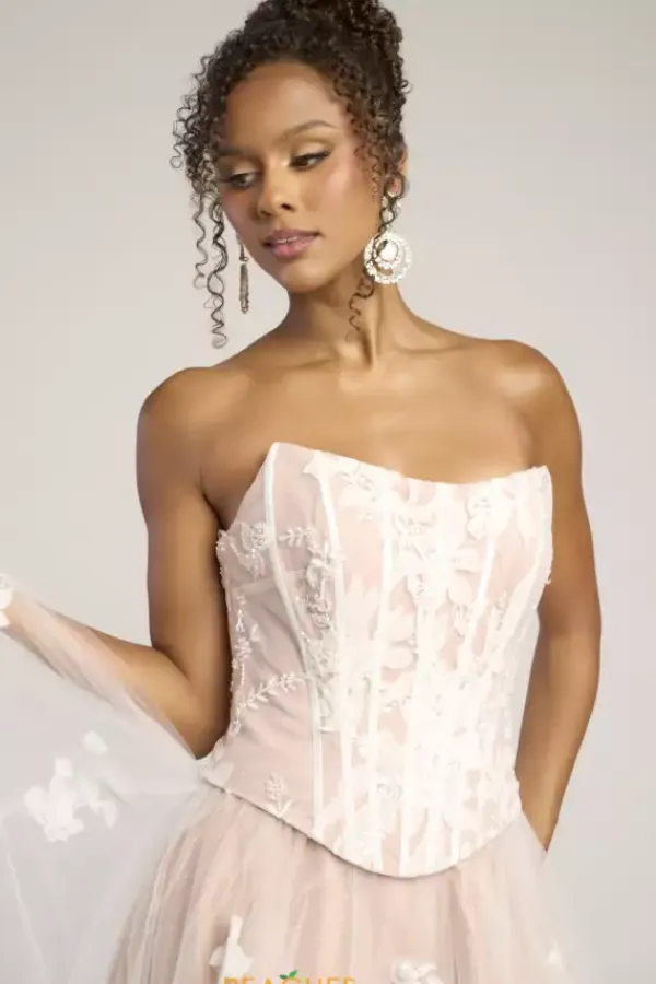Look and feel aesthetically pleasing in this beautiful A line dress designed by Portia and Scarlett style, PS26061. Showcasing a simple yet elegant strapless scoop neckline and a fully structured fitted corset. This entire piece is fully embellished in amazing applique and lace work, achieving a soft beautiful look.