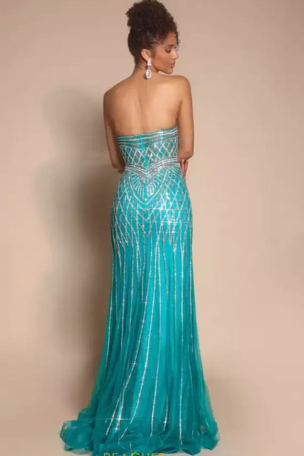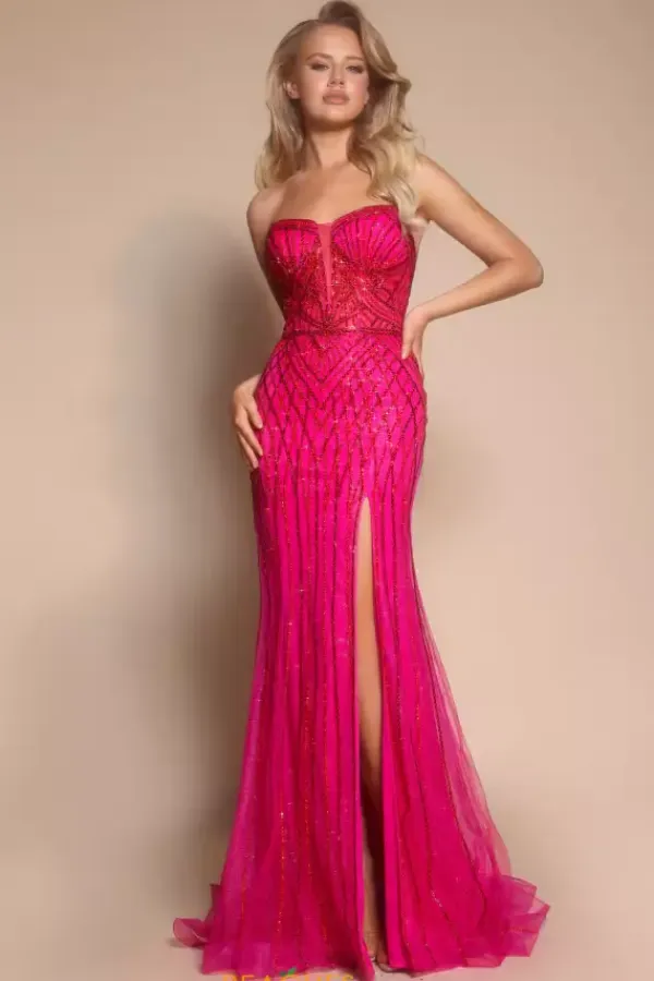 Walk in and strike a pose wearing Portia and Scarlett long dress PS26072. This absolutely striking fitted dress showcases a flattering sweetheart strapless neckline with a full zip up closure unique patterns of intricate beads and sequins add the perfect amount of sparkles ensuring you stand out effortlessly.