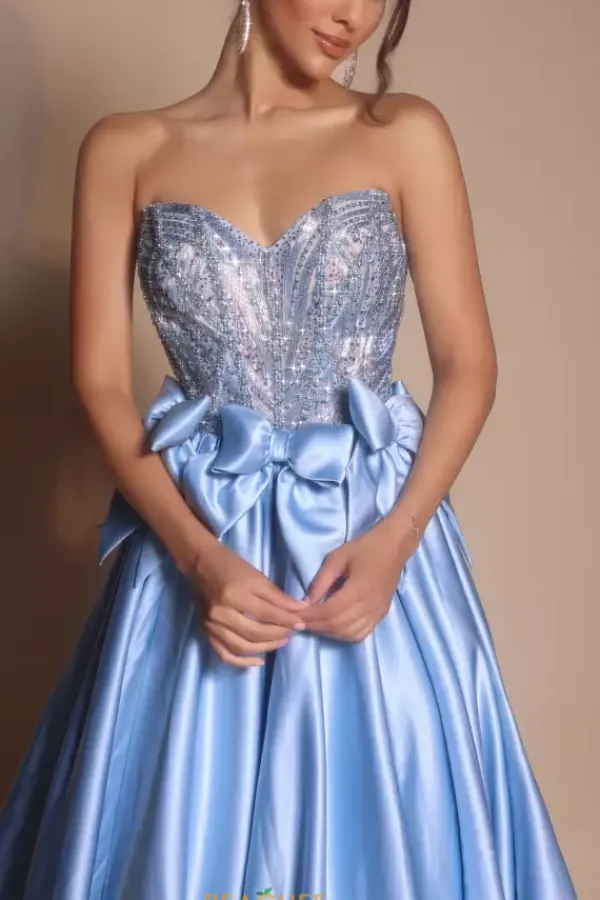 Feel like a modern day princess in this sleek Portia and Scarlett ball gown style PS26077. The beautifully bejeweled strapless sweetheart neckline bodice shimmers from all angles. The a line satin skirt is met at the with large bow details that wrap around you waistline defining your shape..