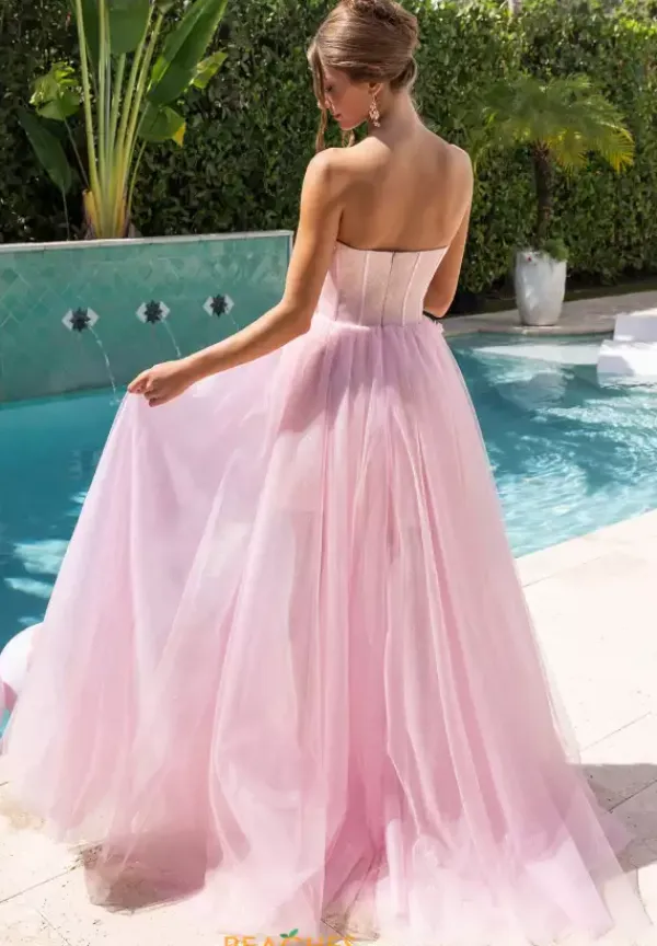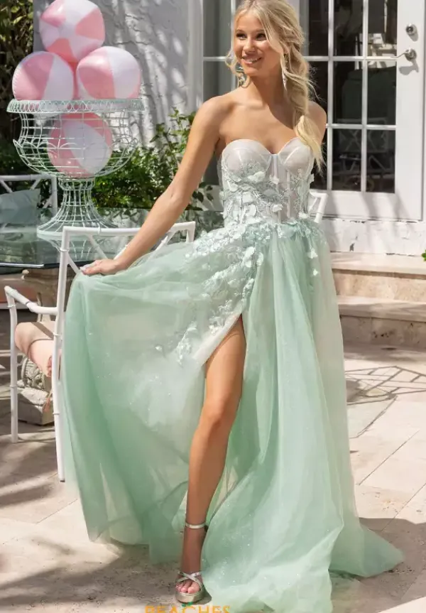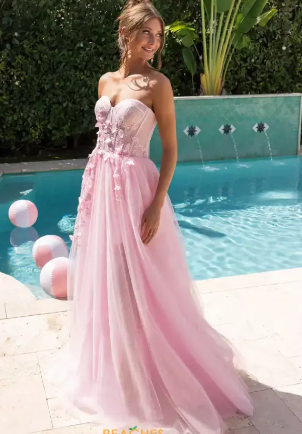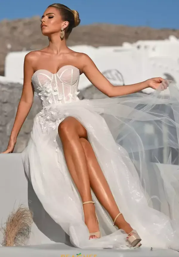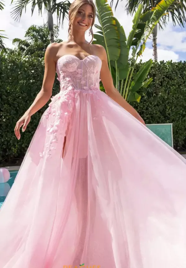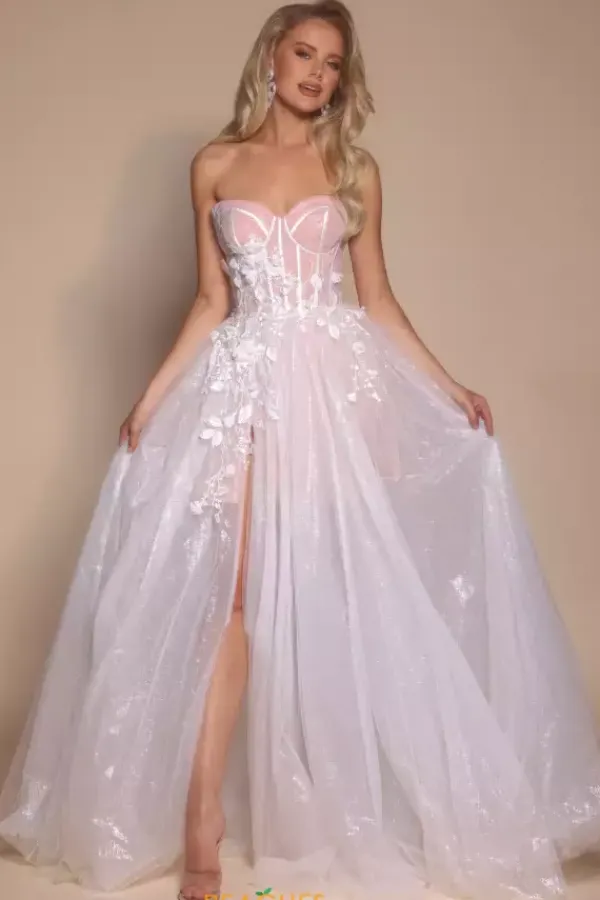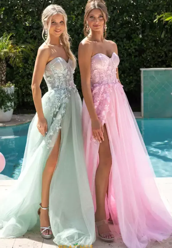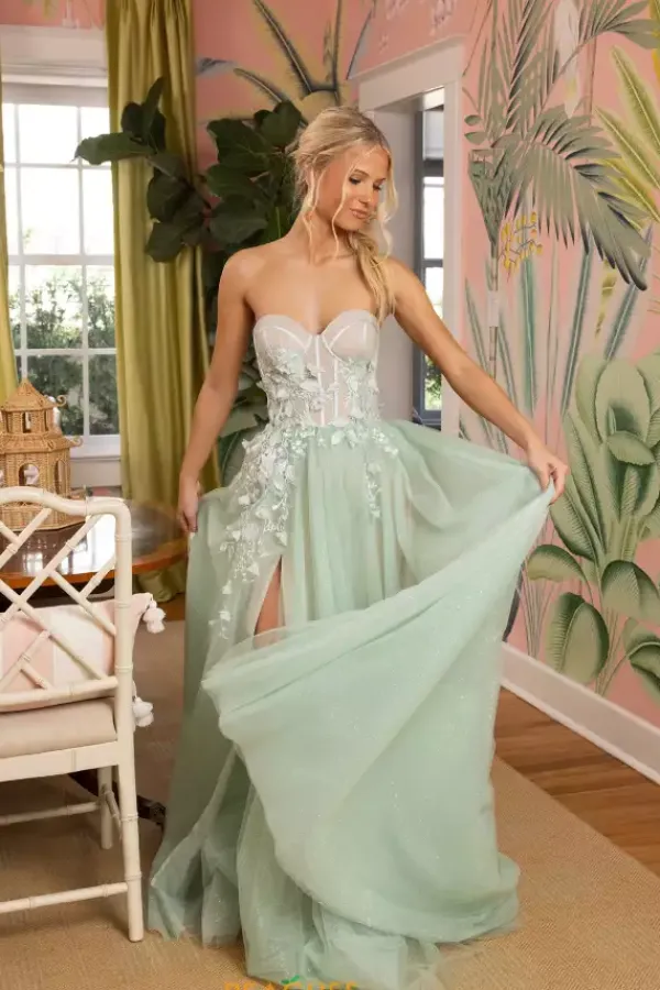 Step out of your comfort zone when you wear this fabulous long A line dress by Portia and Scarlett style PS26078. This bodice features an adorned strapless sweetheart neckline that highlights the beautiful floral applique on the corset. Made in lovely lace and tulle material. The high thigh slit is an absolute must with this dress.