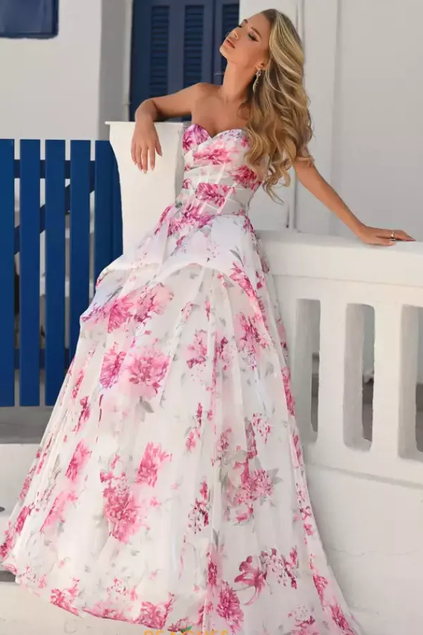 Twirl the night away when you show up wearing this graceful long A line dress by Portia and Scarlett style PS26083. Showcasing a delightful strapless sweetheart neckline that cascades to a corset that’s entirely detailed in floral applique. The playful skirt is made out of organza material so you can dance comfortably.