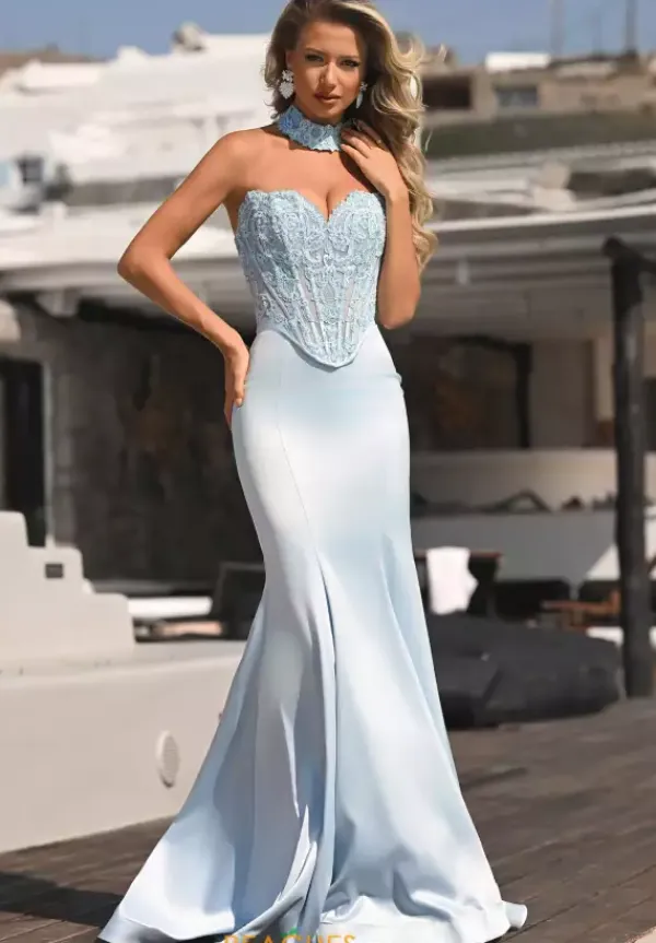 Have a major fashion moment when you go to your next special event wearing this mesmerizing long fitted dress by Portia and Scarlett style PS26086. This body con features a tasteful strapless sweetheart neckline. The corset that will shape your figure is fully detailed in applique and stunning beadwork along with lace. The bottom skirt is made out of jersey material. The long trains finishes the perfect look.