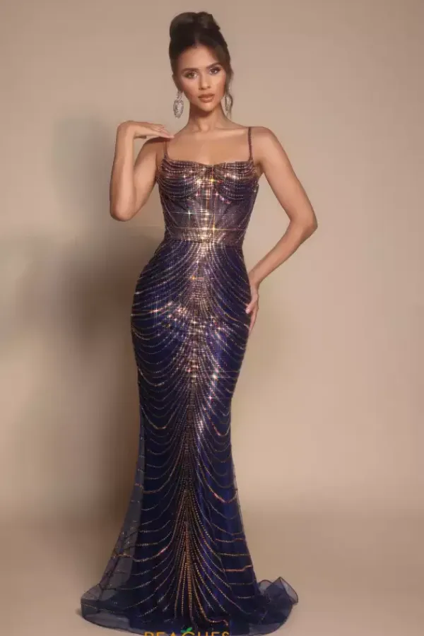 Be the best dressed this prom season in this refined Portia and Scarlett zip up Prom dress style PS26095. Radiant dainty beads adorn this no slit sweep length dress from top to bottom in a sophisticated draped fashion that is featured across the classy scoop neckline. The skirt is completed with a tulle train.