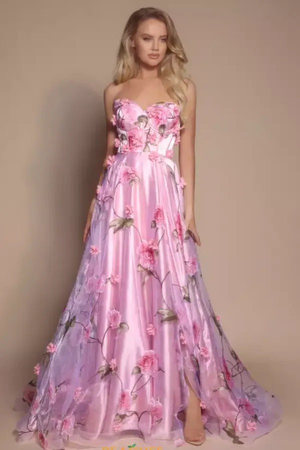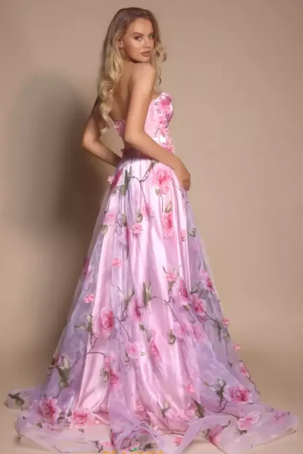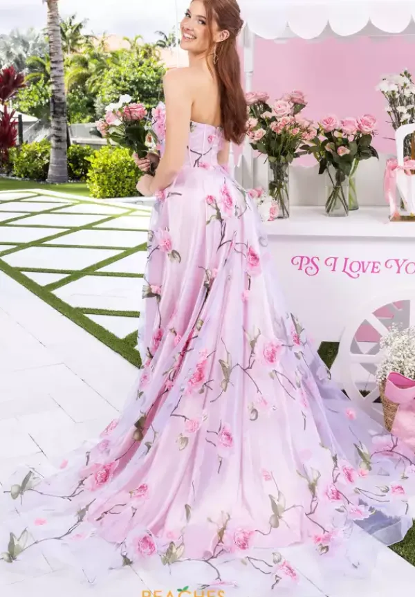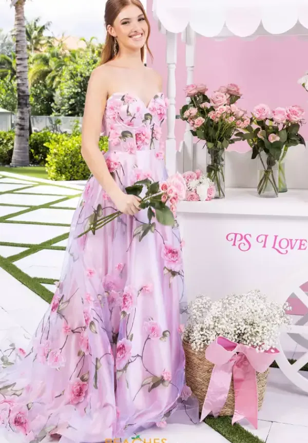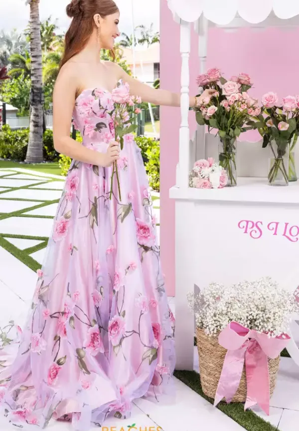 Sweet sophistication exudes when you wear this phenomenal Portia and Scarlett A line dress style PS26180 made in a lovely pink print. This impeccable gown features a strapless corset with a sweetheart neckline, visible boning and low zipper closure back. The long, a line dress has an organza overlay adorned with 3D flower blossoms and embroidered vines with a horsehair hem edge that sweeps the floor.