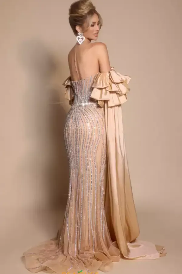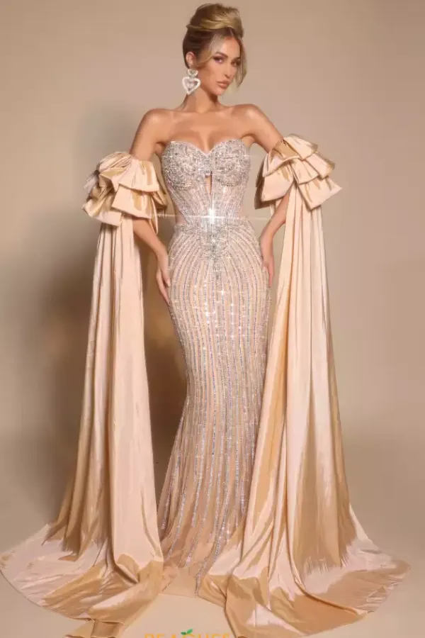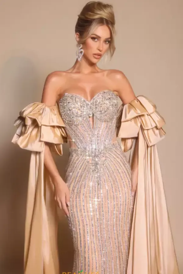 Amp up the drama at your next social occasion wearing this sophisticated Portia and Scarlett long dress style PS26195. This glamorous gown is encrusted completely with sparkling bead work and showcases a strapless fitted bodice with a sweetheart neckline, front cut out and zipper closure low back. Add the draping off the shoulder sleeves sold separately as style PS26195SL for extra flair. The long slim skirt flows to the floor.
