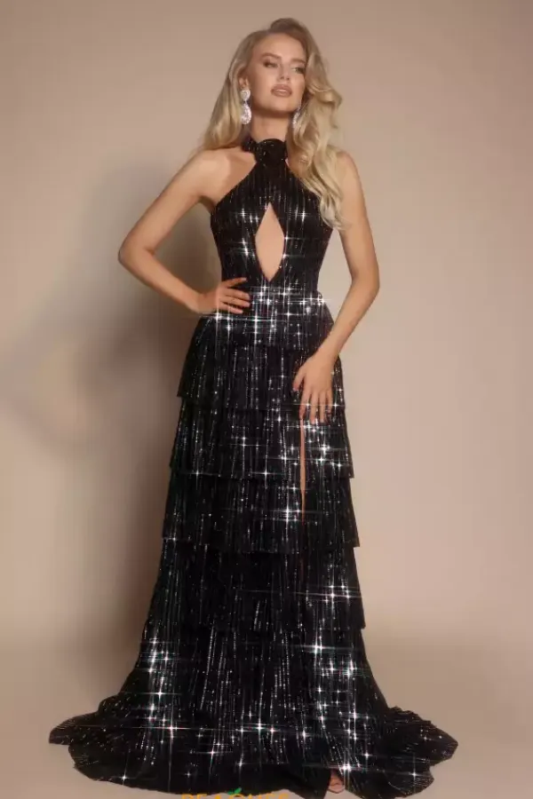 Be the queen of everything in this intriguing fully glistening Portia and Scarlett fit and flare Prom dress style PS26198. Delicate dainty rows of silver beading begin at the halter neckline and trickle throughout every tier of the shimmering floor length skirt. The fitted bodice displays a sexy keyhole opening.