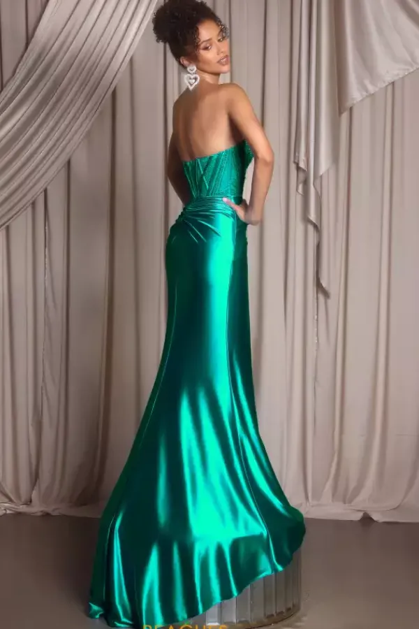 Simply chic is this satin Portia and Scarlett long fitted dress style PS26228. A must have choice for your prom this strapless v neckline dress has an embellished bodice with hot set rhinestone beading. Available only in the fabulous emerald color, the ruched waist line is ultra flattering with a thigh high front side slit.