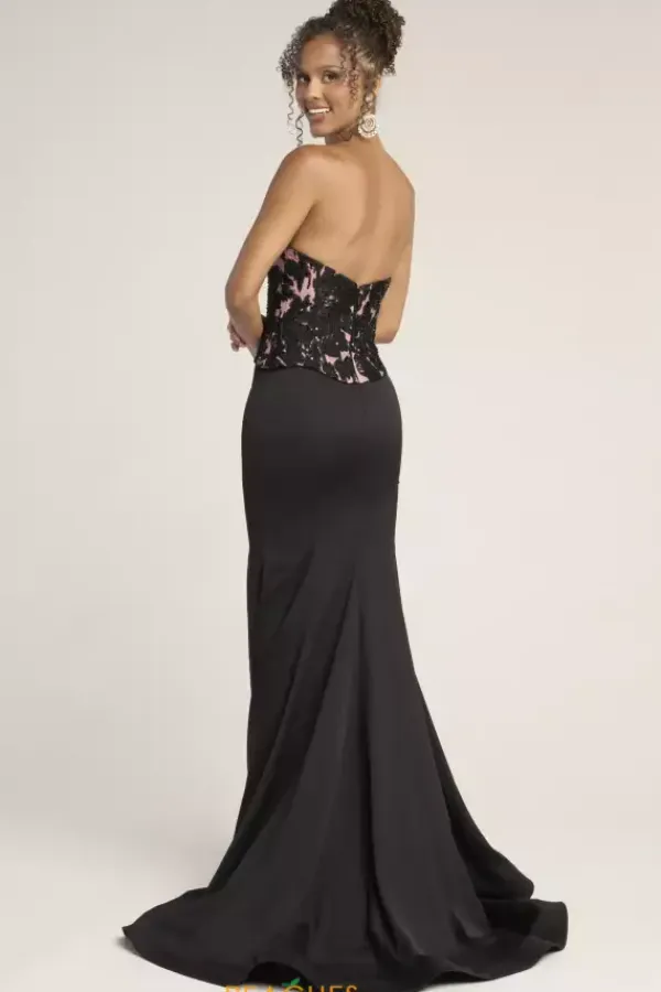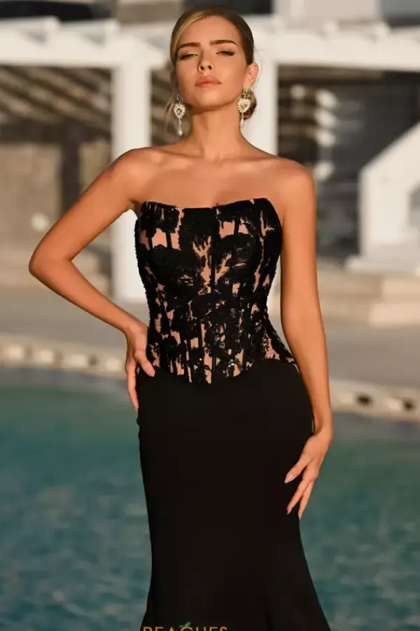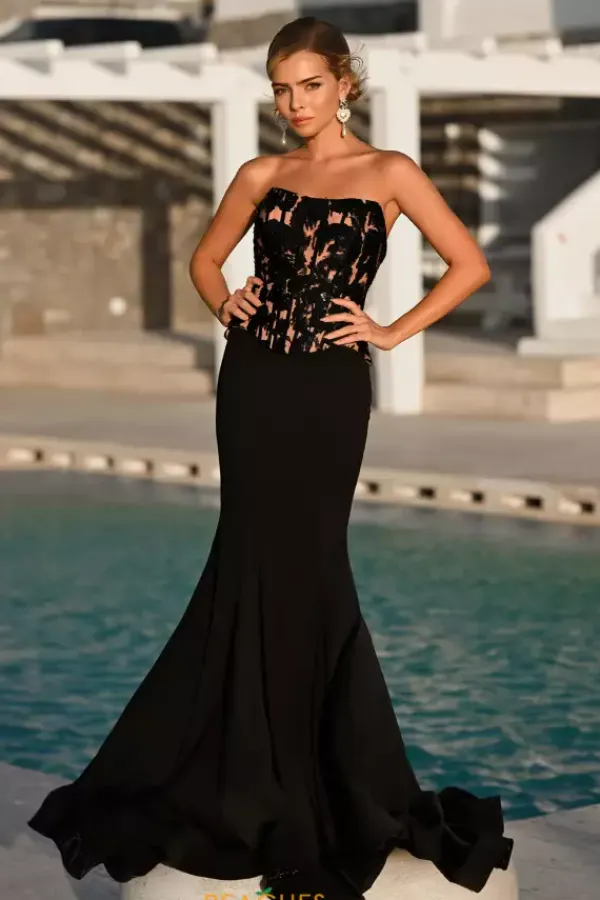 Exude sophistication when you wear this gorgeous Portia and Scarlett long dress style PS26301E. This impeccable gown showcases a corset bodice with nude lining on the black adorned with beaded appliques with a strapless scoop neckline and low back with zipper closure. The long slim skirt flows to the floor with a horsehair hem edge and sweeping back train.