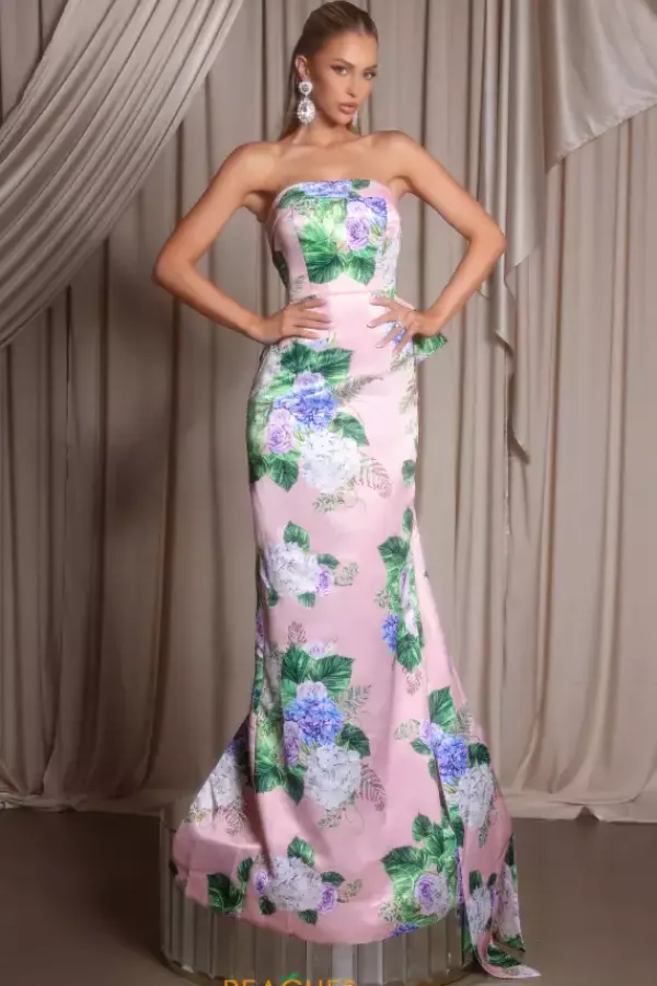 Classic elegance exudes when you wear this lovely Portia and Scarlett long dress style PS26308E to prom. Made in a fabulous pink floral print fabric, this outstanding gown features a strapless fitted bodice with a zipper back with draping bow detailing. The long sheath skirt flows to the floor with a back sweep train.