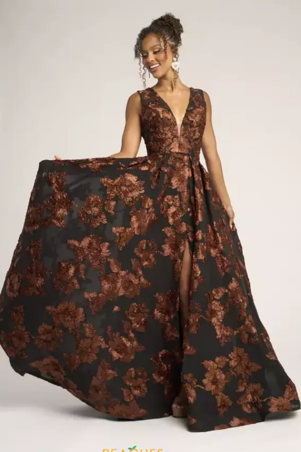 Be fabulous in this Portia and Scarlett A line dress style PS26312E. The novelty appliqued dress has a v neckline with thick shoulder straps and a mocked v open back, The skirt falls from the small of your waist with just the right amount of fullness. A front thigh high slit makes it easy to dance the night away.