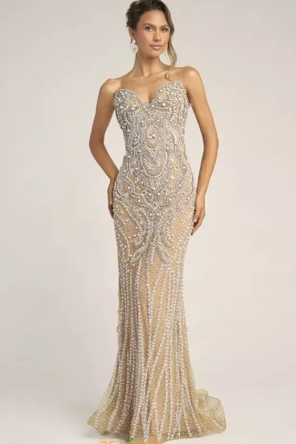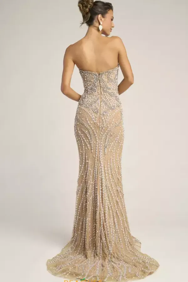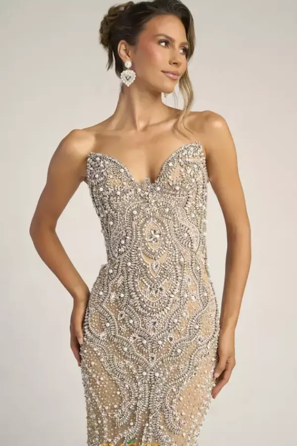 All eyes will be on you when you enter the dance in this gorgeous vintage inspired Portia and Scarlett long dress style PS26446C. The strapless v neckline dress is encrusted with al the right bead work. Rhinestones, pearls, beads and sequins are all hand sewn into a gorgeous pattern like no other.