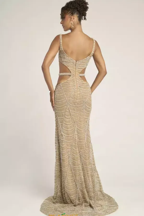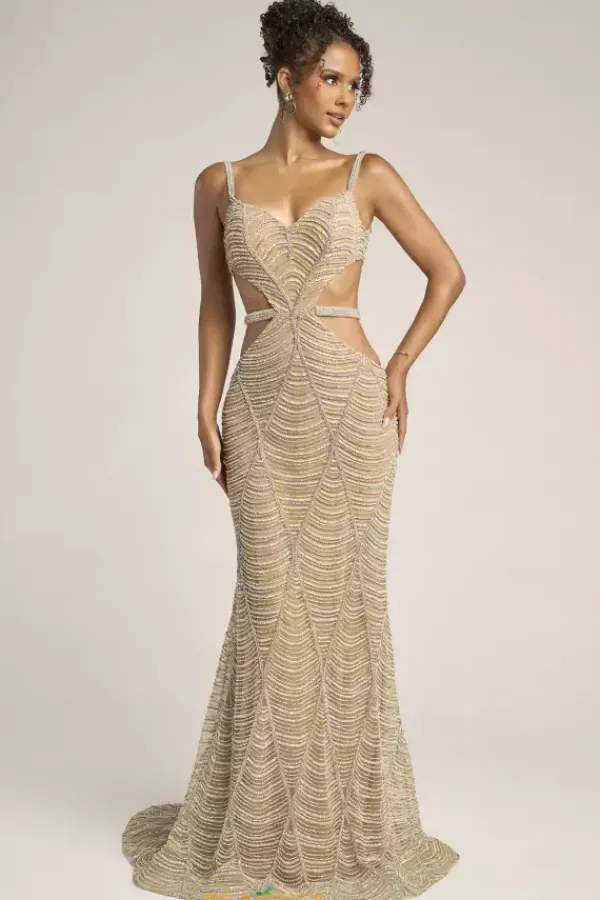 Rows and rows of beading give this Portia and Scarlett long dress that perfect vintage vibe. Style PS26455C has a v neckline with thick shoulder straps. The sides of the dress are cut out with a matching beaded straps that wraps around to define your shape. The endless beadwork gives a sleek old hollywood look.