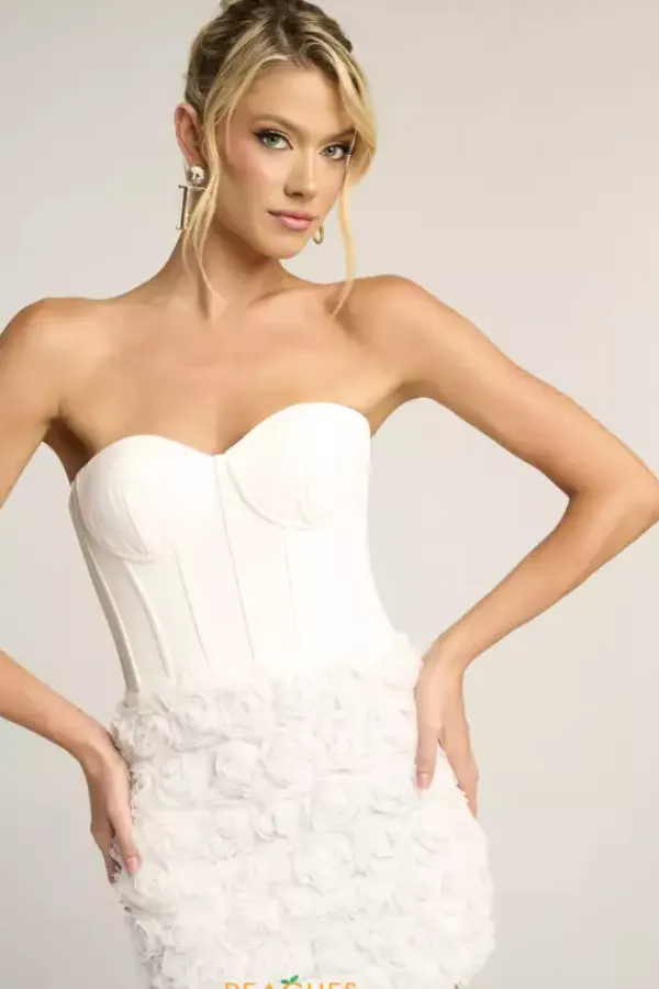This little Portia and Scarlett white dress style PS26500 will make the world revolve around you. The short fitted silhouette flaunts an on trend strapless corset bodice paired with the cinchable lace up closure on the back. White novelty rosettes have been sewn into horizontal rows across the short skirt.