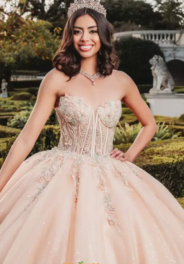 Dreamy Amabella ballgown style Q1003 shows off a stunning fitted corset bodice embellished in ethereal beading that includes charming three dimensional floral details. Corset boning compliments the sweetheart neckline that can either be worn as strapless or with lovely appliqued off the shoulder cap sleeves. More applique gently rains down the top of the dramatic sparkle tulle skirt. Detachable bow.