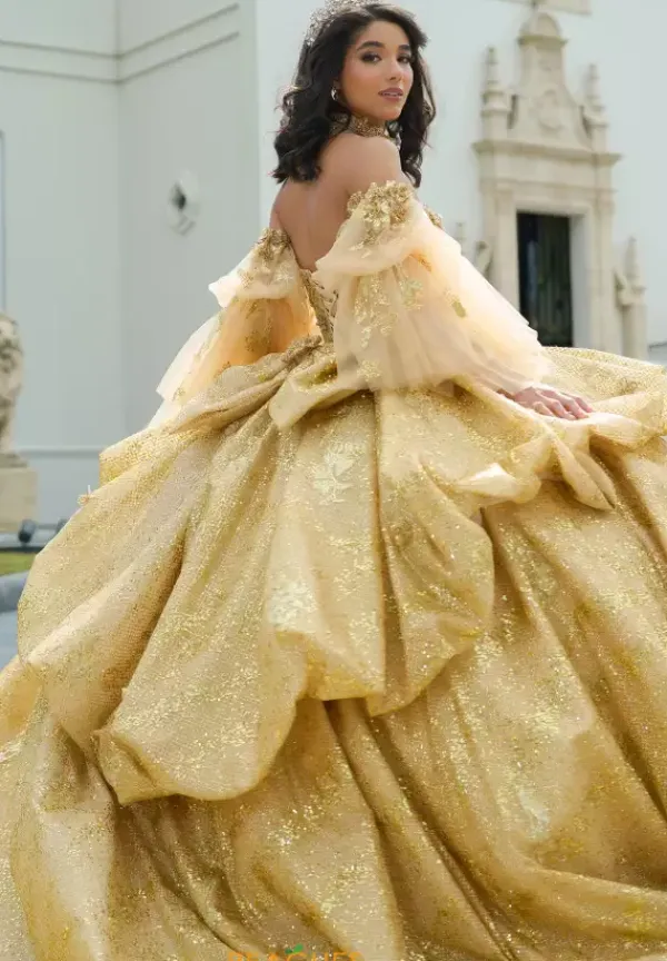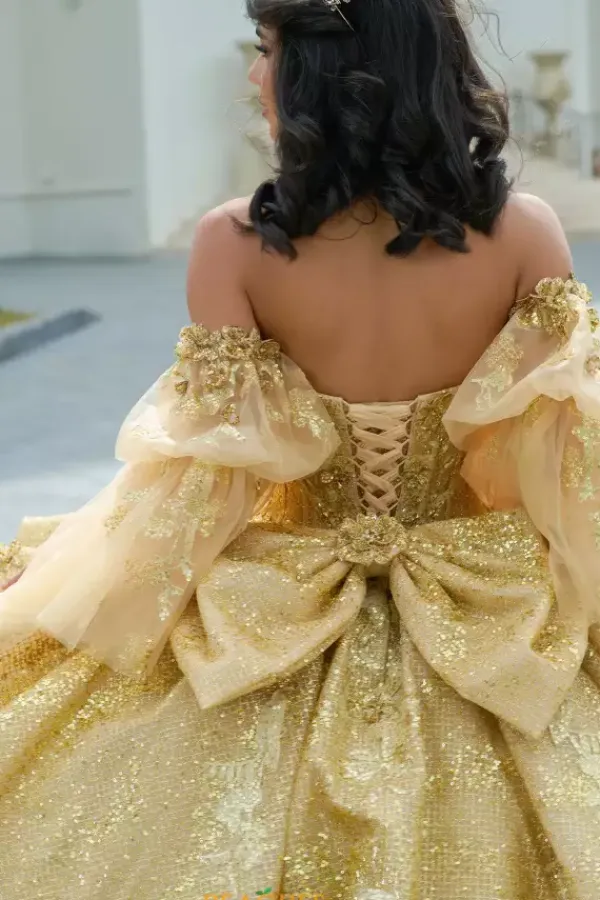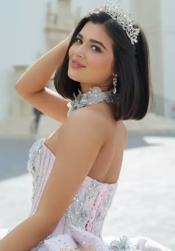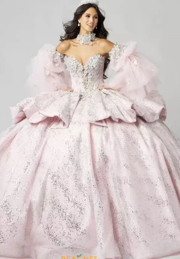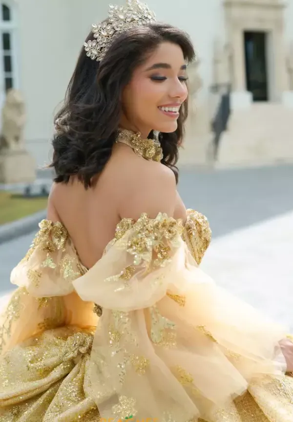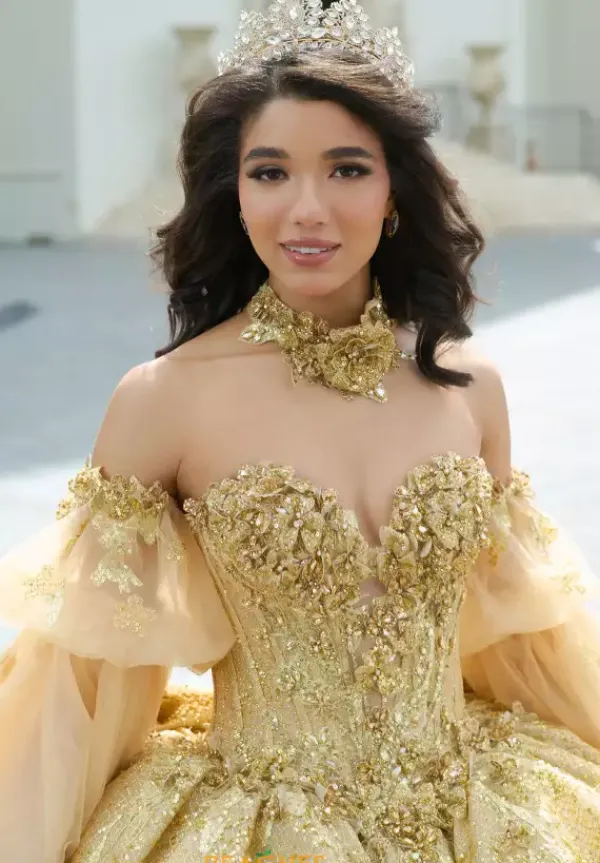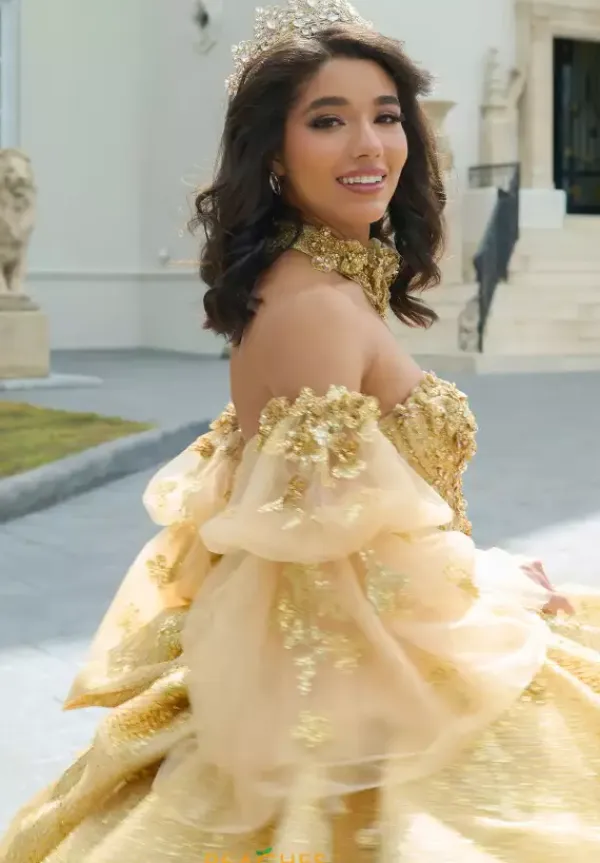 Leave everyone stunned when wearing this one of kind Amabella dress, style Q1051. This ball gown is adorned with stunning applique and gorgeous beadwork, making this dress truly breathtaking. This beautiful corset comes with a matching choker necklace and detachable sleeves, allowing you to switch up your look. The bow and the train add the perfect flair to this dress.