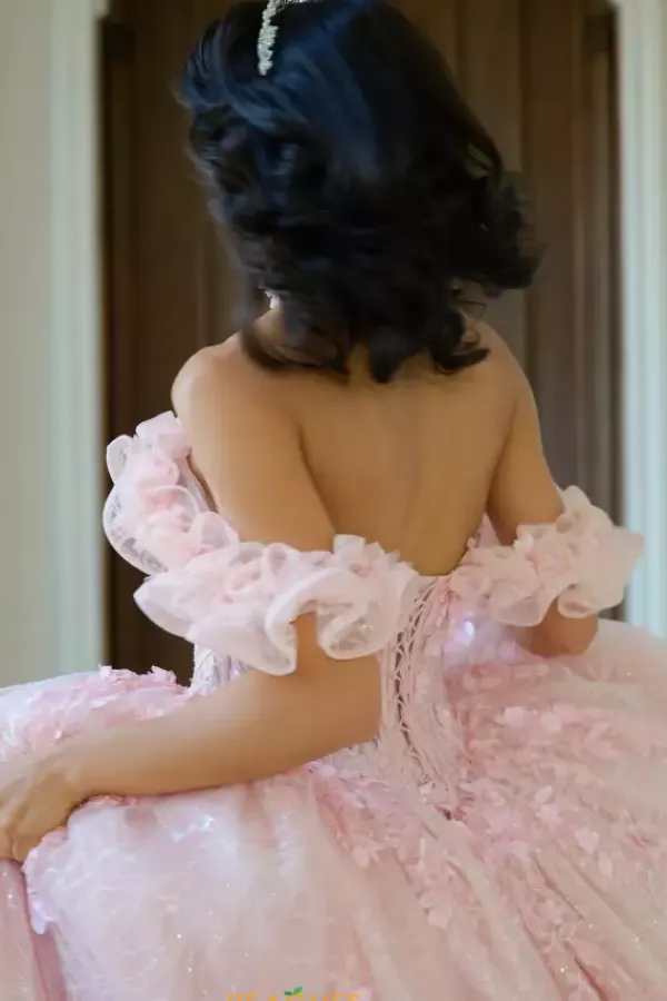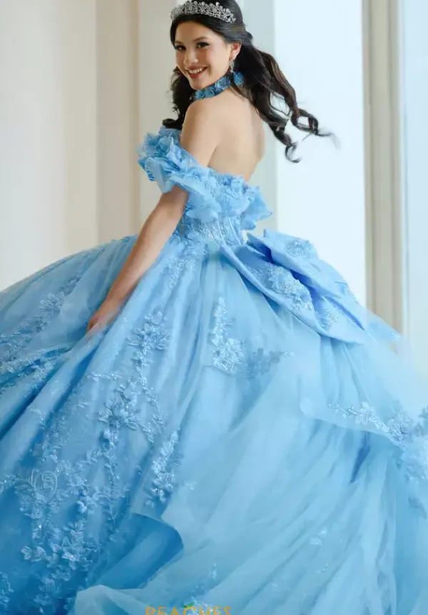 Feel regal when you wear this Amabella quinceanera dress on your special day, style Q1065. This long waisted bodice has a deep v neckline with ruffled off the shoulder cap sleeves. The dress comes with a chocker necklace made from the matching appliques from the gown. The tulle ball gown skirt has a bow in the back with a detachable long train.