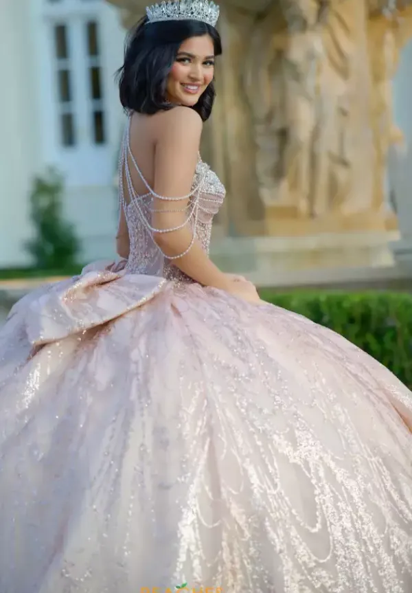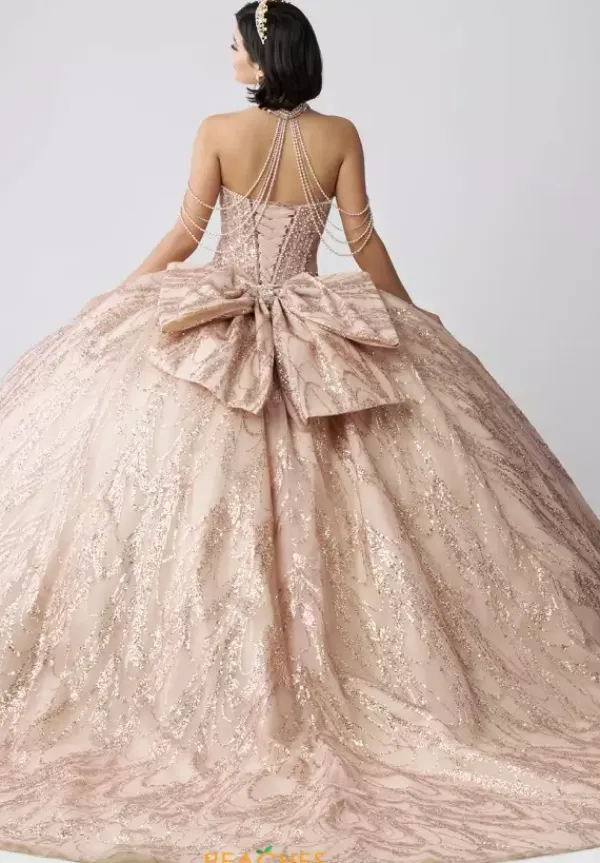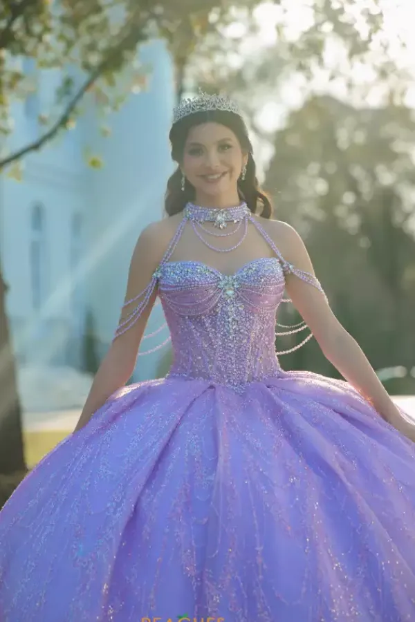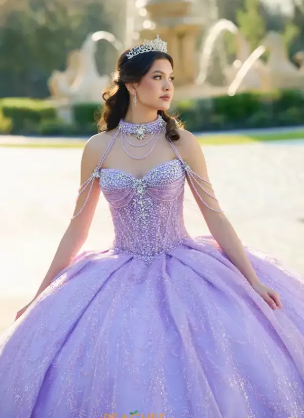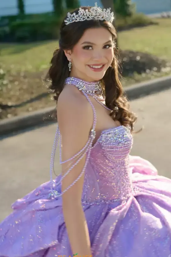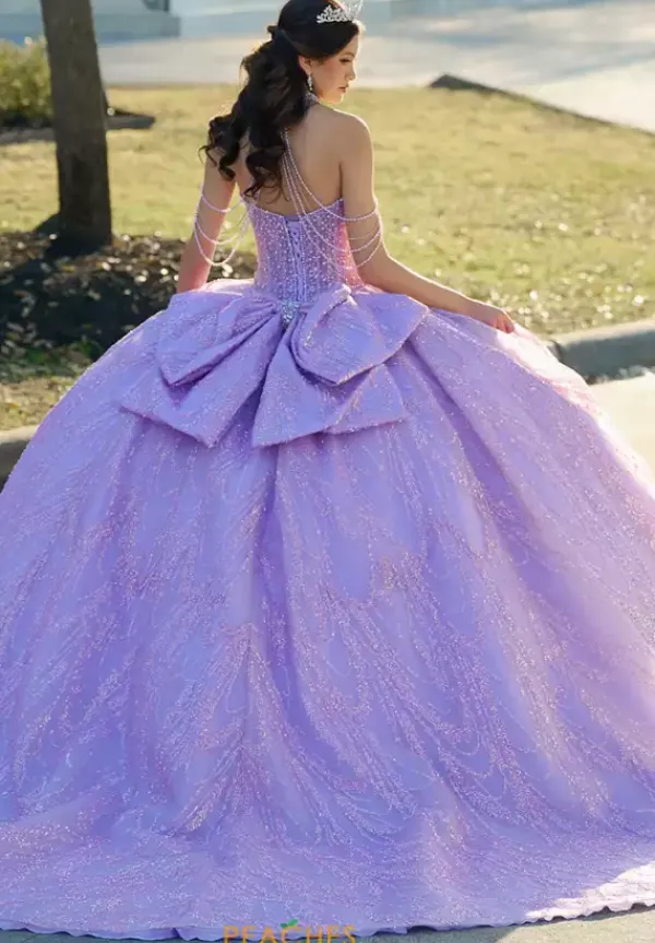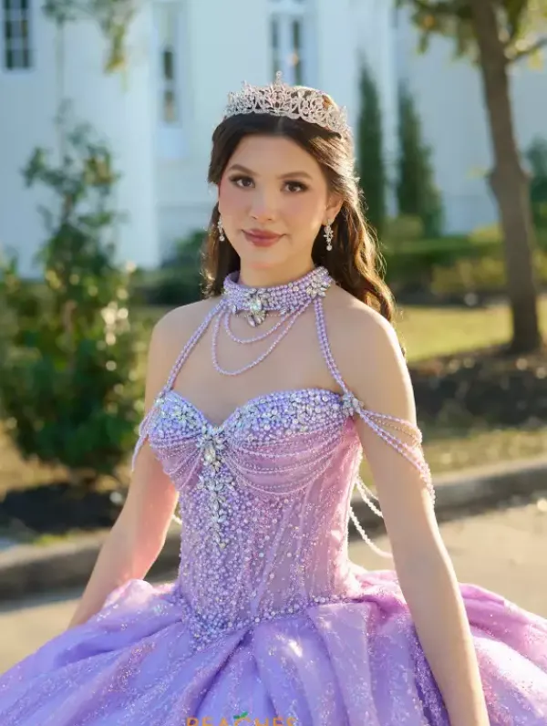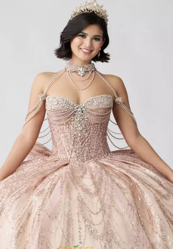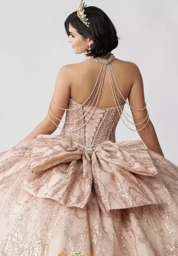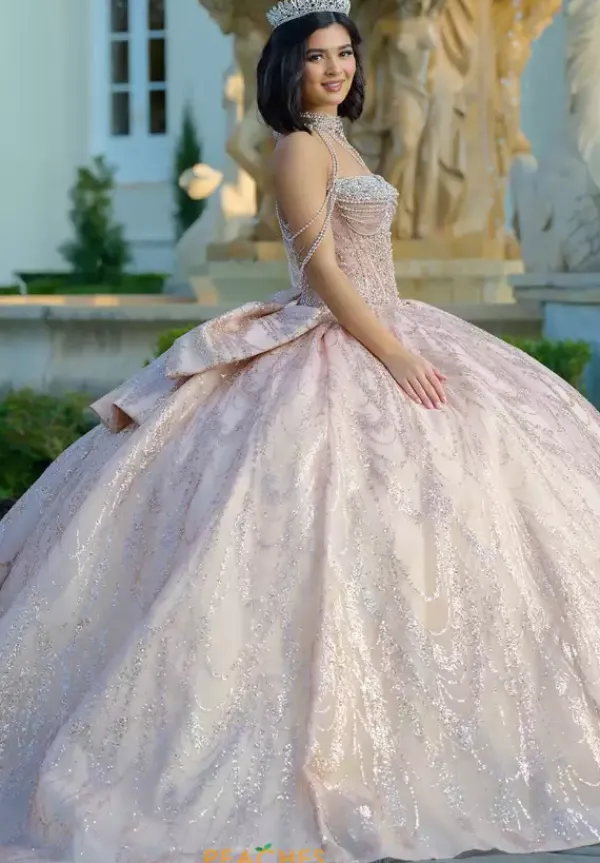Dance the night away in this amazing Amabella ball gown style Q1067 for your quinceanera. This heavy embellished sweetheart neckline bodice has a beaded halter straps and hanging beaded cap sleeves. The dress comes with a matching choker necklace. The dress is made from a shimmering glitter ball gown skirt with a bow detail in the back.