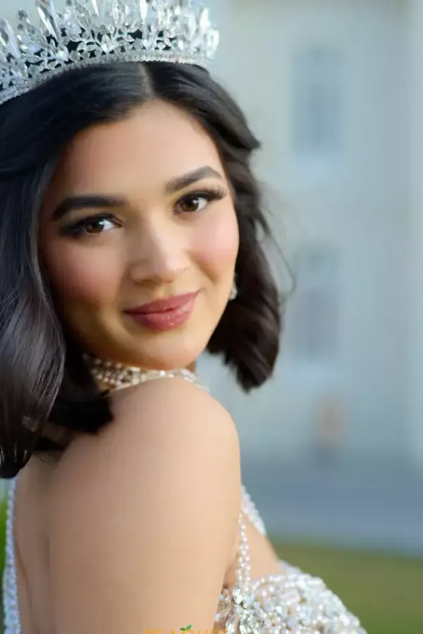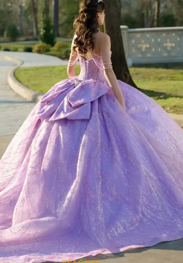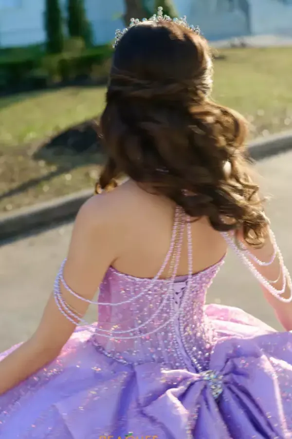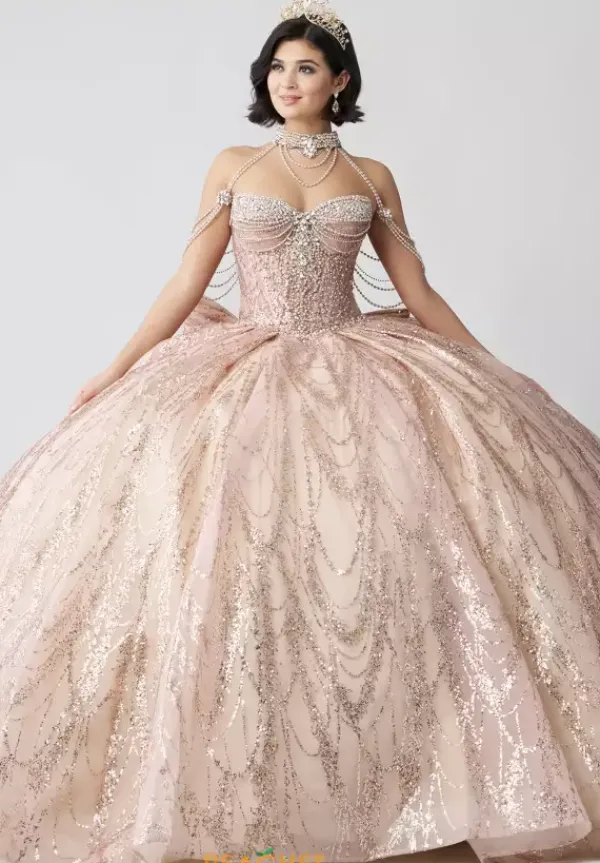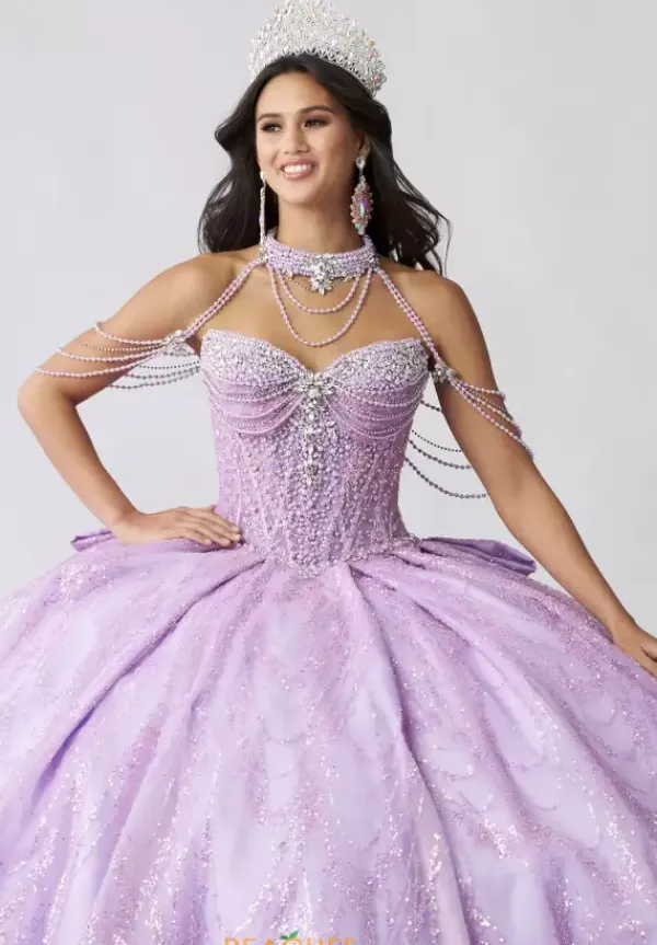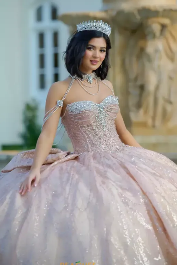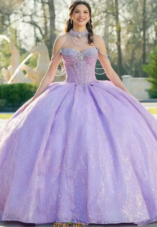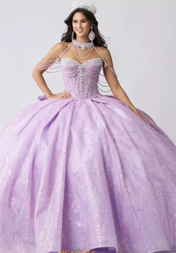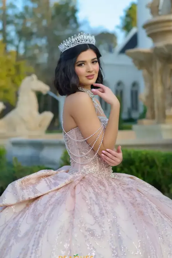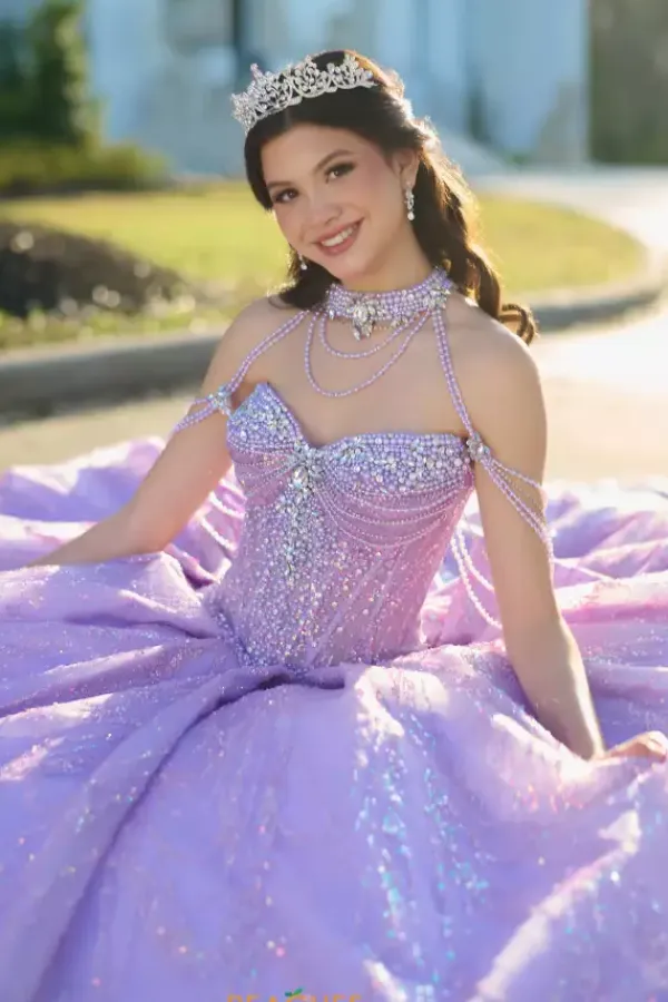 Dance the night away in this amazing Amabella ball gown style Q1067 for your quinceanera. This heavy embellished sweetheart neckline bodice has a beaded halter straps and hanging beaded cap sleeves. The dress comes with a matching choker necklace. The dress is made from a shimmering glitter ball gown skirt with a bow detail in the back.