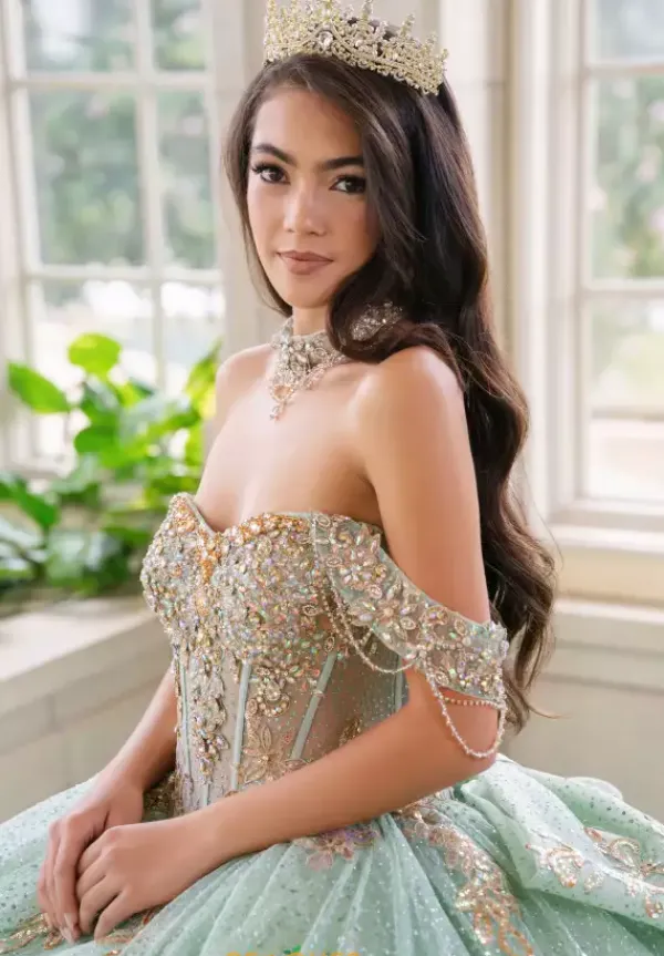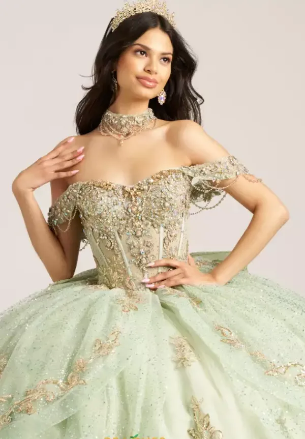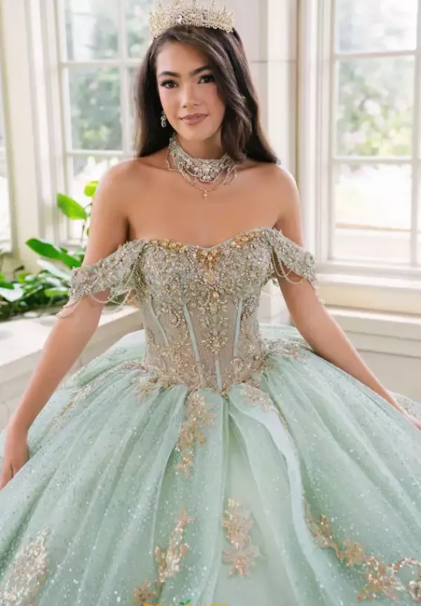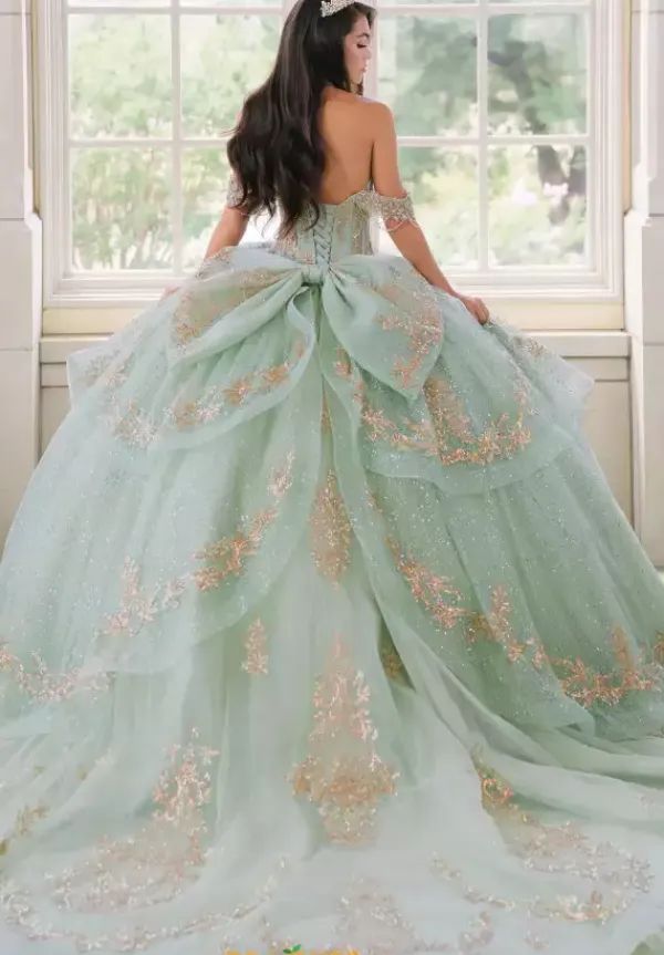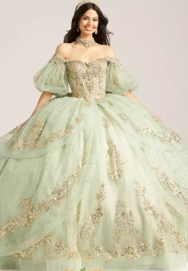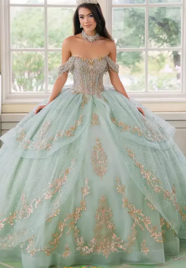 Have your fairy tale princess moment when you wear this Amabella gown Q1082 to your Quinceanera. This gorgeous corset bodice has two sets of detachable sleeves, a set of off the shoulder cap sleeves and a set of pouf sleeves. The sheer illusion bodice is encrusted with sparkling gems and rhinestone beadwork all hand sewn. The tiered glitter tulle skirt is trimmed in metallic gold appliques. A chocker necklace and detachable bow come with this dress.