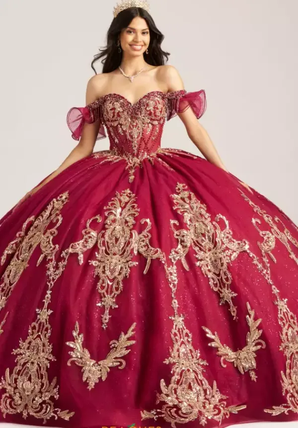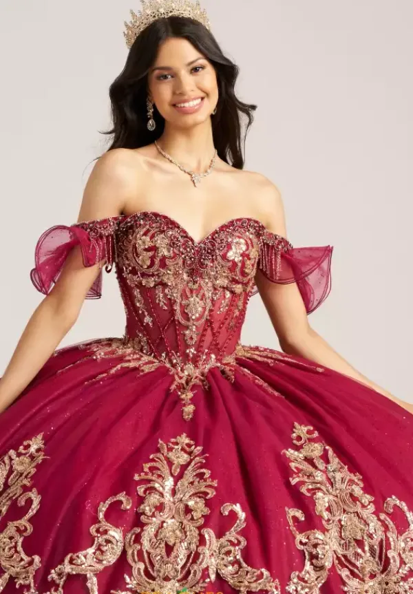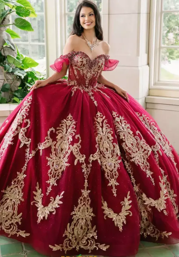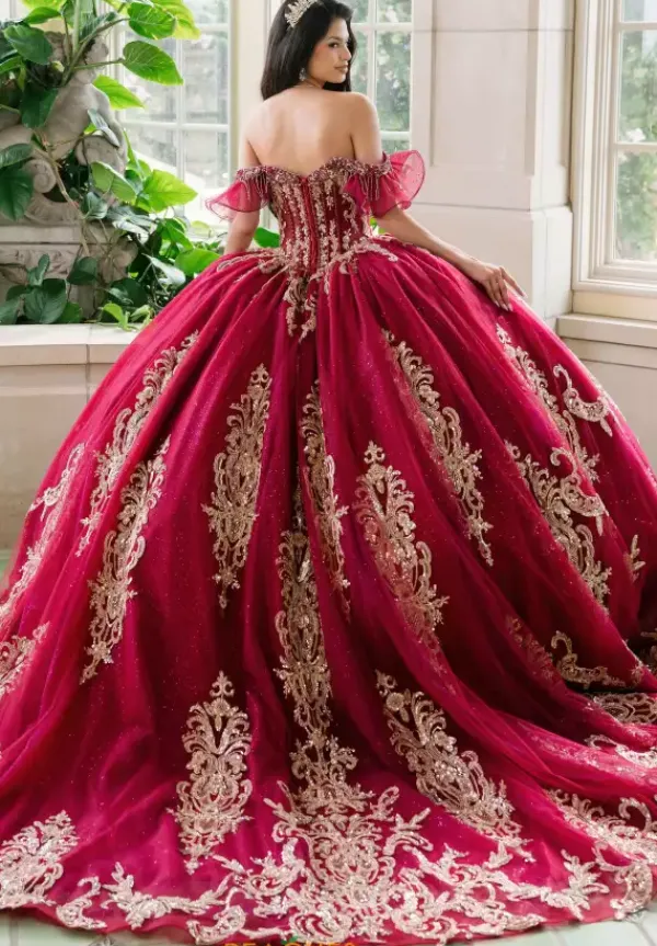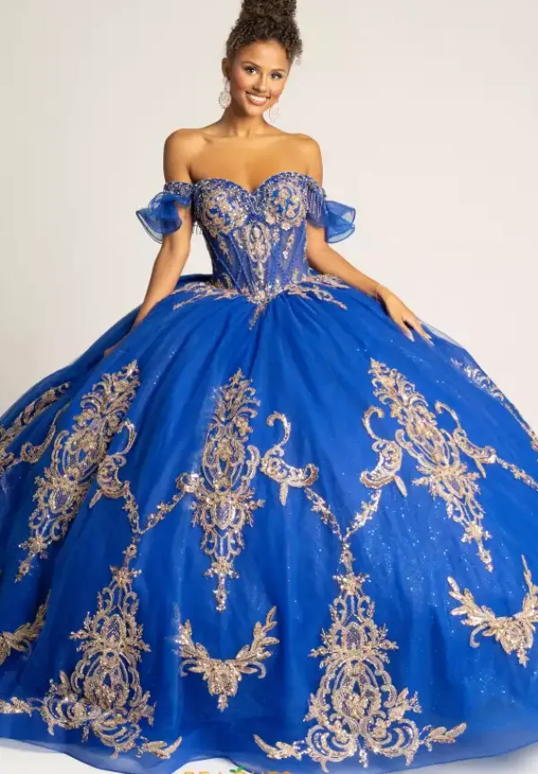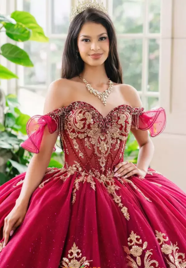 Show off your glamorous side in this stunning Amabella ball gown style Q1095. The strapless sweetheart corset bodice has detachable off the shoulder cap sleeves. The gold metallic appliques detail the bodice and then continue onto the full sparkling tulle skirt with a love bow in the back.