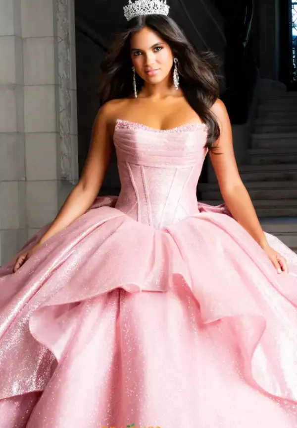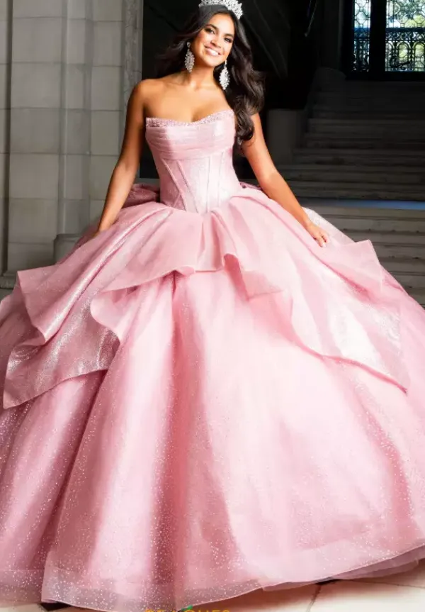 Glow with elegance when you don this sensational dress by Amabella style QA111. This Quinceanera dress features a strapless scoop neckline that may be paired with 2 different pairs of off the shoulder sleeves. One pair of sleeves is a classic cap sleeve and the other choice is a cap sleeve with a stunning bow with long tails. The top of the dress contains beading and a corset, supported by a corset lace up. The skirt showcases an overskirt, train and a beautiful bow.
