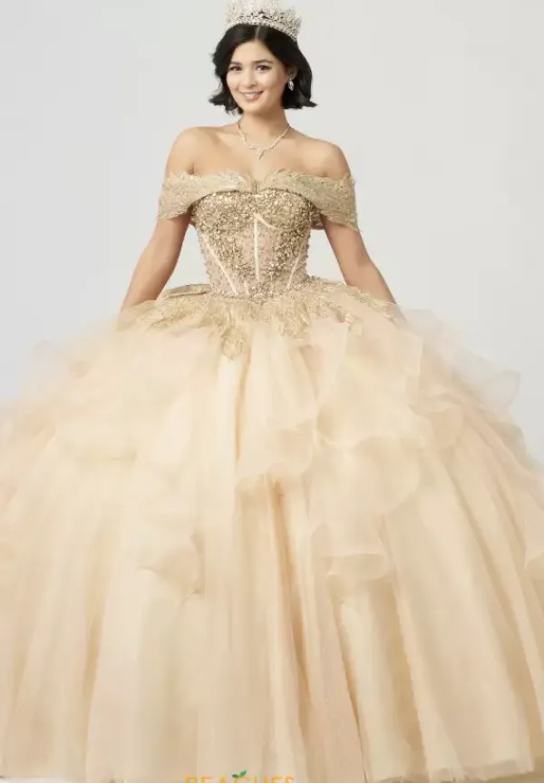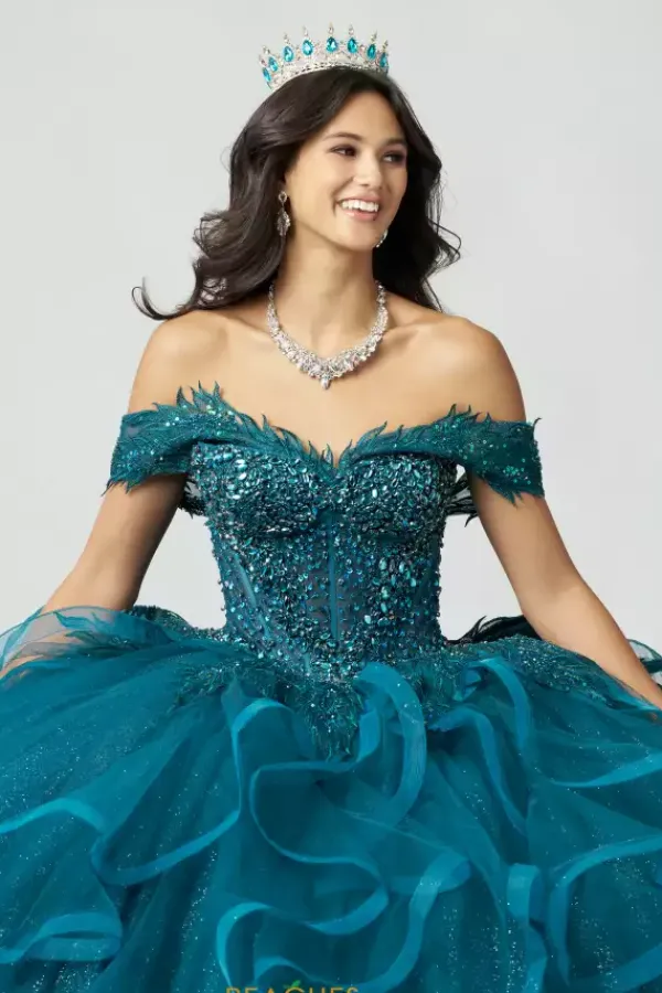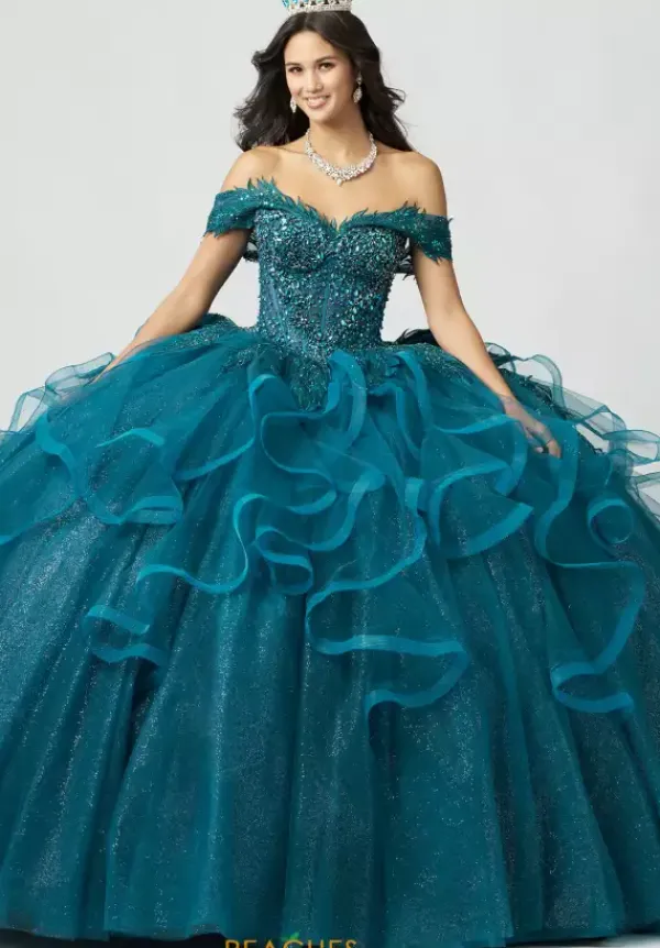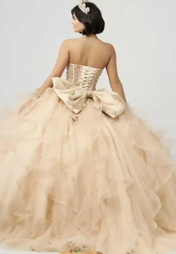 Stun the crowd when you walk into your Quinceanera with this ball gown from Amabella style QA151. The dress has a two in one look with detachable off the shoulder cap sleeves that can become a strapless sweetheart neckline bodice. The bodice is enriched with sparkling rhinestones and bead work over a sheer illusion. The ruffle tulle skirt flows effortlessly with a bow detail in the back.