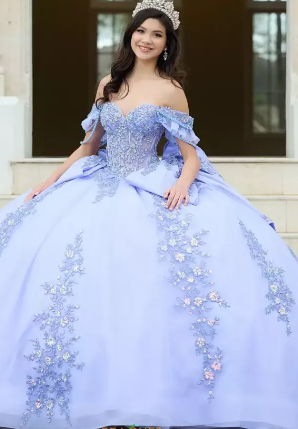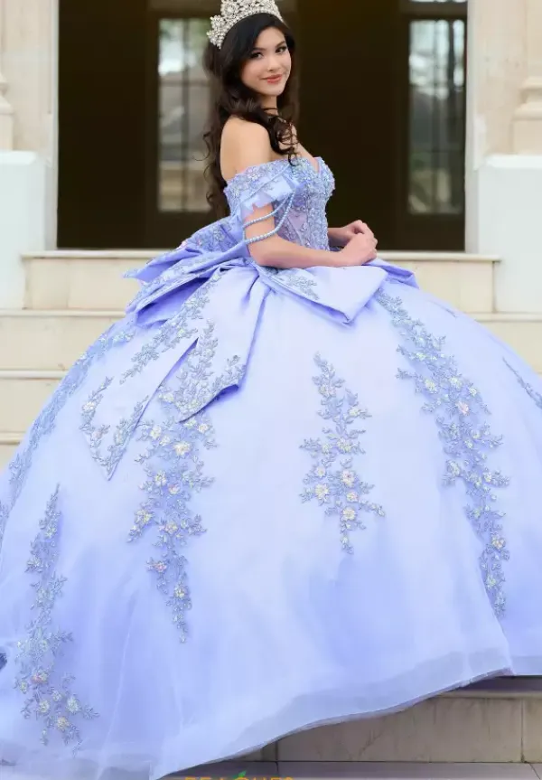 You can never have enough bows with this Amabella ball gown style QA155. This quinceanera dress has a off the shoulder cap sleeve that is detachable from the sweetheart neckline long waisted bodice. Two large bows sit at the hips of the skirt as well as the back of the dress. Gorgeous shimmering lace appliques adorn the bodice and continue onto the full tulle skirt.