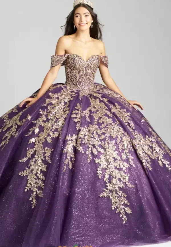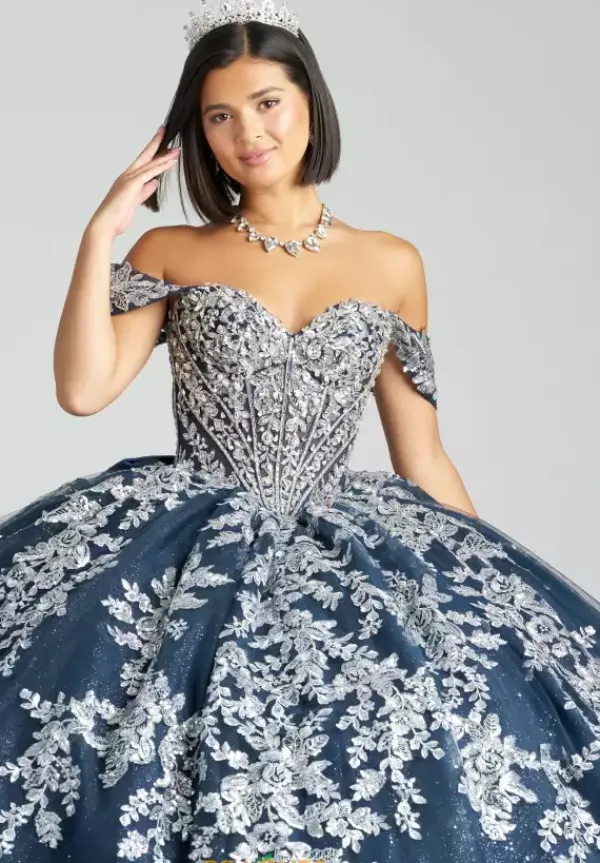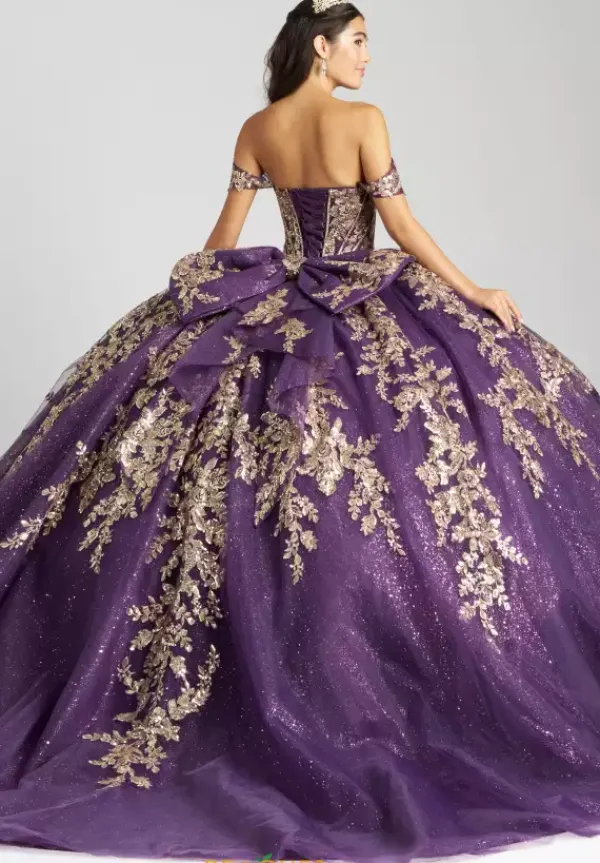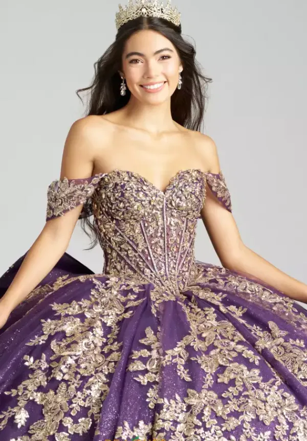 We are just in love with this metallic sparkling ball gown from Amabella style QA161. The sweetheart neckline bodice has detachable off the shoulder cap sleeves. The bodice features this striking metallic grand appliques that pop against the dark color of the dress. The full glitter tulle ball gown skirt continues those appliques dripping down the skirt with a detachable bow in back.