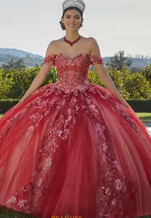 Channel your inner princess and wear lovely ball gown dress 34091 by Vizcaya. This glittering dress features radiant combinations of floral embroidered patterns and beadwork that is featured throughout the entire dress. Cinch and adjust the bodice with the trendy corset lace up and have a remarkable exit with a classic sweep train.