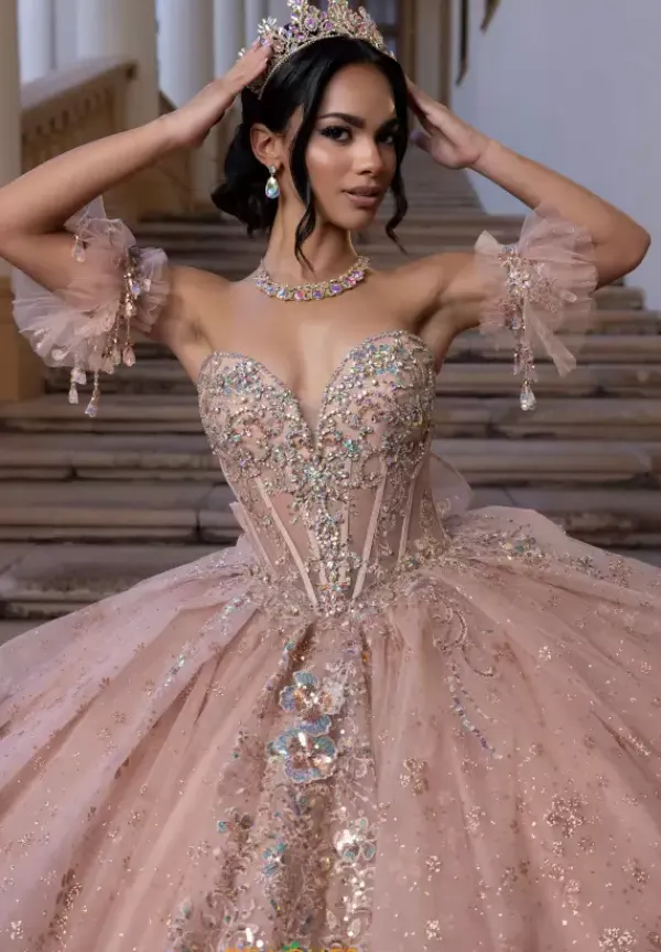 Glisten, sparkle and shimmer in this radiant Vizcaya Quinceanera ball gown style 4080002. The strapless sweetheart neckline showcases a drop waist bodice. Detachable crystal and pearl draped chocker matches the detachable off the shoulder sleeves. The dress is adorn in glittery appliques with a detachable flower back bow.