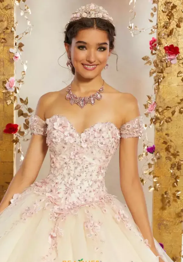 You are sure to feel like a princess on your special day when you wear this gorgeous Valencia quinceañera ball gown 60071. The fantastic floral gown has a strapless sweetheart neckline and detachable cap sleeves. The corset bodice is adorned with three dimensional flowers, and has a lace up back. The full tulle skirt showcases more floral embroidery and applique, which taper off towards the bottom. This gorgeous gown features a flowing train which adds the perfect finishing touch.