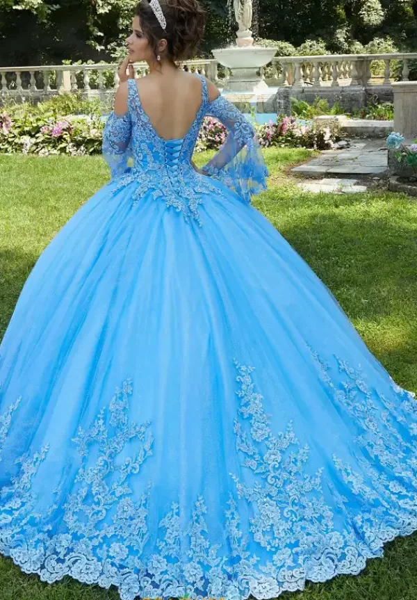 Amazing Vizcaya ball gown dress 89270 features a stunning v neckline supported by dainty straps, bell sleeves for added drama, and striking bodice decked in baroque lace embellishments. This number is enhanced with hand sewn bead work and a show stopping ballgown silhouette. Finish the style off with a captivating train lined with lace appliques and you’re ready for your special occasion!