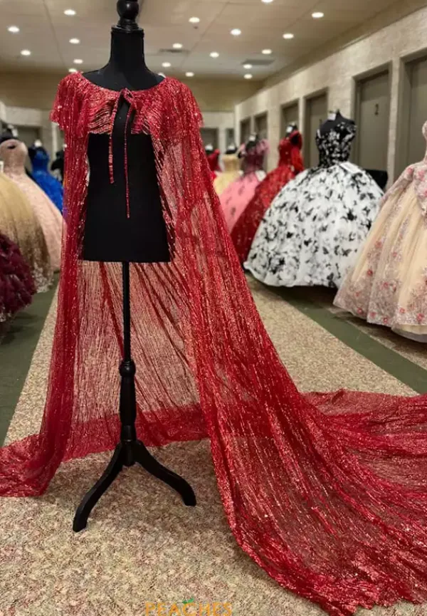 This is the cape only. Gorgeous long cape is made in a glitter tulle fabric, available in stunning colors and adorned with cracked ice. Tie closure pulls this style together at the center front with a detail of a ruffle around the top. This accessory elevates any social occasion dress instantly while the full train adds extra drama.