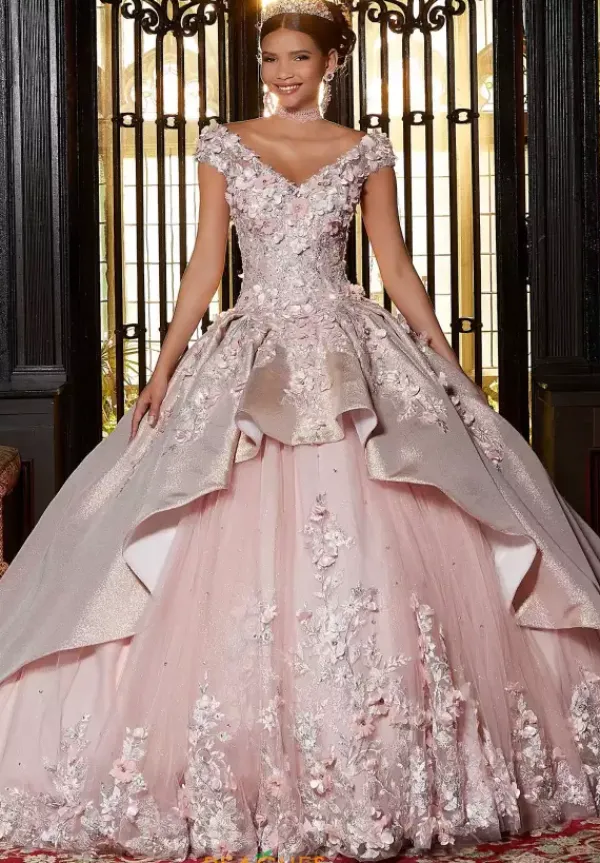 Up the chic factor and wear this Vizcaya ball gown dress 89331 for your quinceanera. This striking ball gown in made from a novelty material unique to all others. The v neckline showcases cap sleeves and an adjustable lace up in the back give you a snug fit. Three dimensional flowers line the bodice and fall onto the peplum style skirt. The exposed tulle in the front is bordered with matching details.