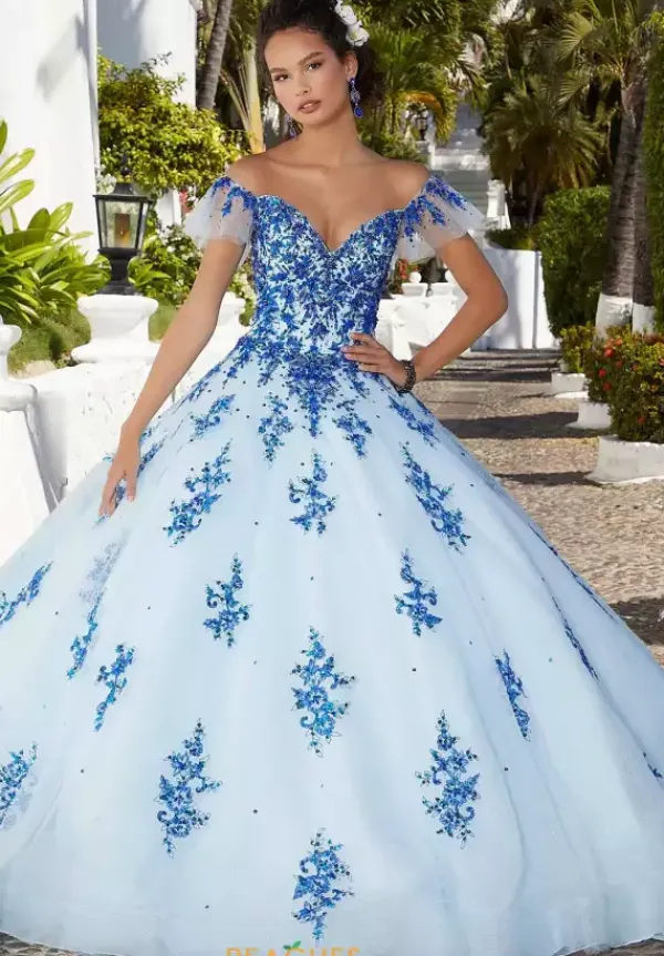 All eyes will be on you when you enter the room wearing this Vizcaya ball gown 89365. This beautiful v neckline showcases an off the shoulder cap sleeve made from ruffly tulle. Contrasting embroidered appliques deck the bodice and continue down the full tulle ball gown skirt. The exquisite train completes the look. A matching stole included.