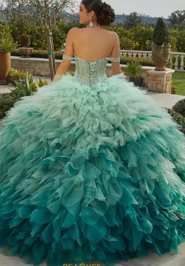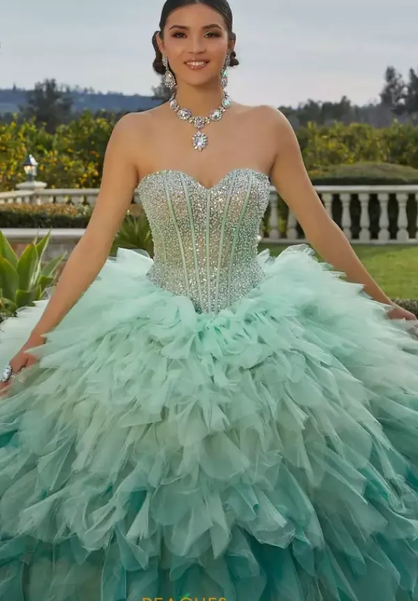 Be the most memorable in unforgettable Vizcaya ball gown dress 89438. Stunning from top to bottom, this traditional style features the elongated corset bodice that is entirely adorned in glistening combinations of beads and sequins. The ruffled skirt is made from different colors of tulle that create a stunning ruffled effect that ends at the sweep train. Matching stole included.